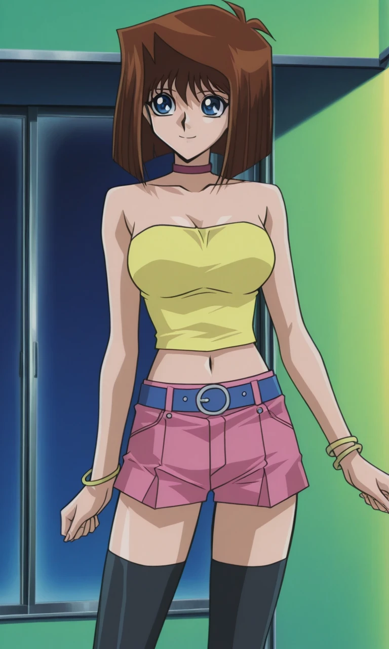 Tea Gardner,1girl,solo, redbrown hair, short hair,blue eyes, bob cut, bangs,bracelet,yellow tube top,midriff, pink shorts,belt,blue belt, black thighhighs,