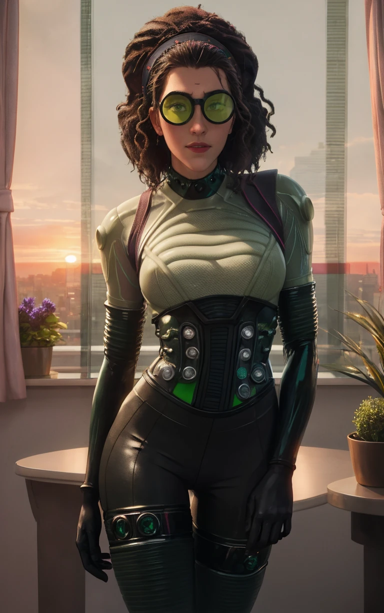 1girl, brown hair, long hair, dark-skinned female, afro, dreadlocks, big hair, braid, single hair bun, medium breasts, breasts, goggles, tinted eyewear, headband, hairband, lipstick,