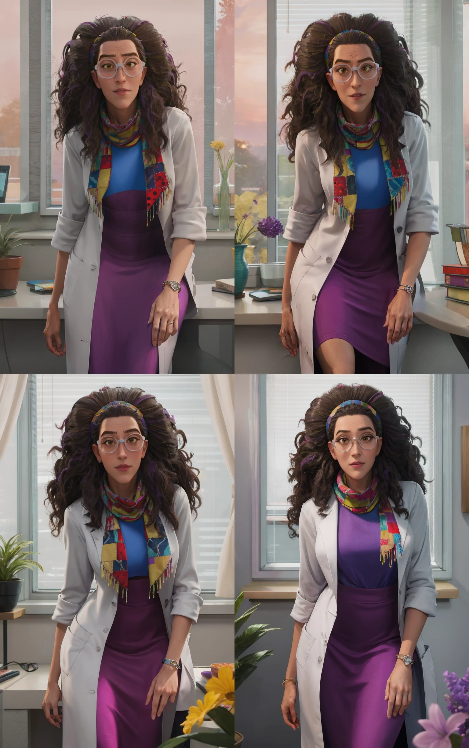 labcoat, scarf, multicolored clothes, purple dress, shirt, sleeves rolled up,
