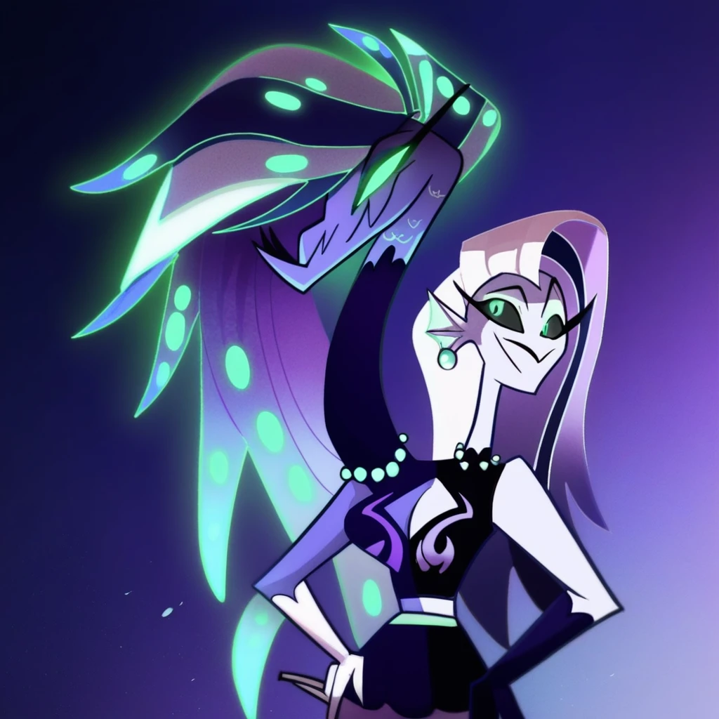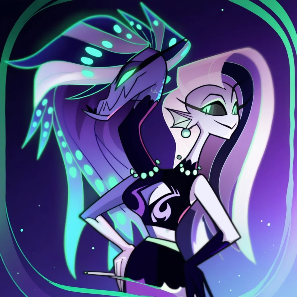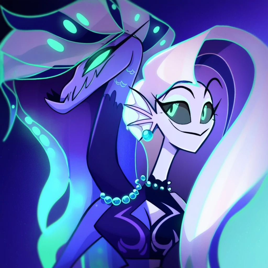 Levy, 2 heads, dicephalous, monster head, ear fins, multicolored skin, black sclera, green eyes, long hair, multicolored hair, white hair, purple hair, glowing hair, boob window, skirt, earrings, necklace, jewelry