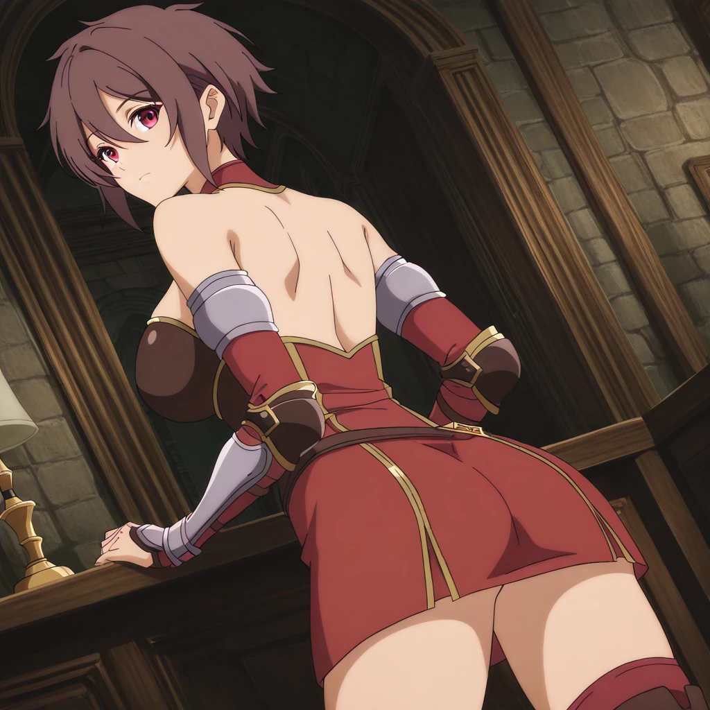 cape, red dress, short dress, gauntlets, boots, breastplate