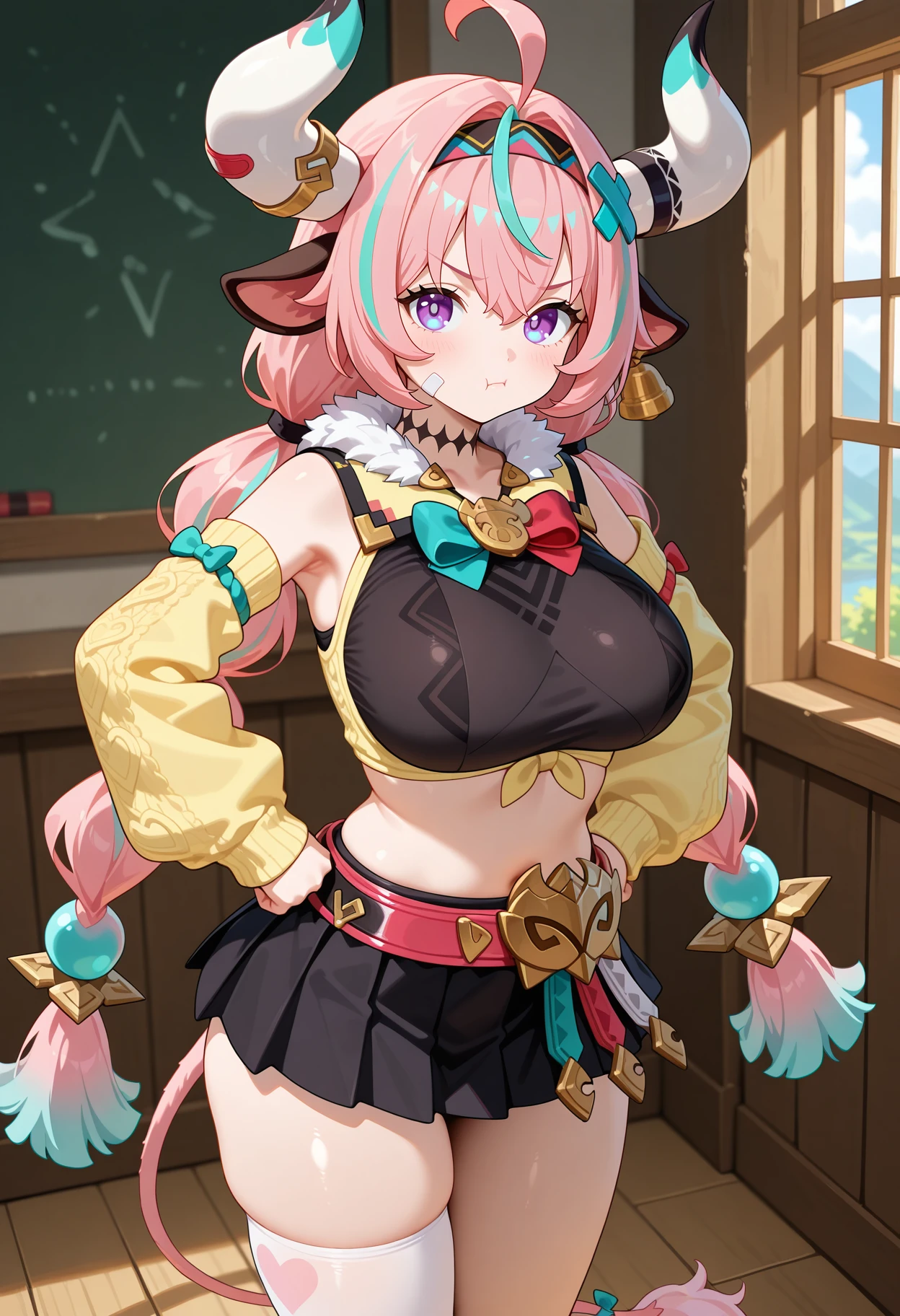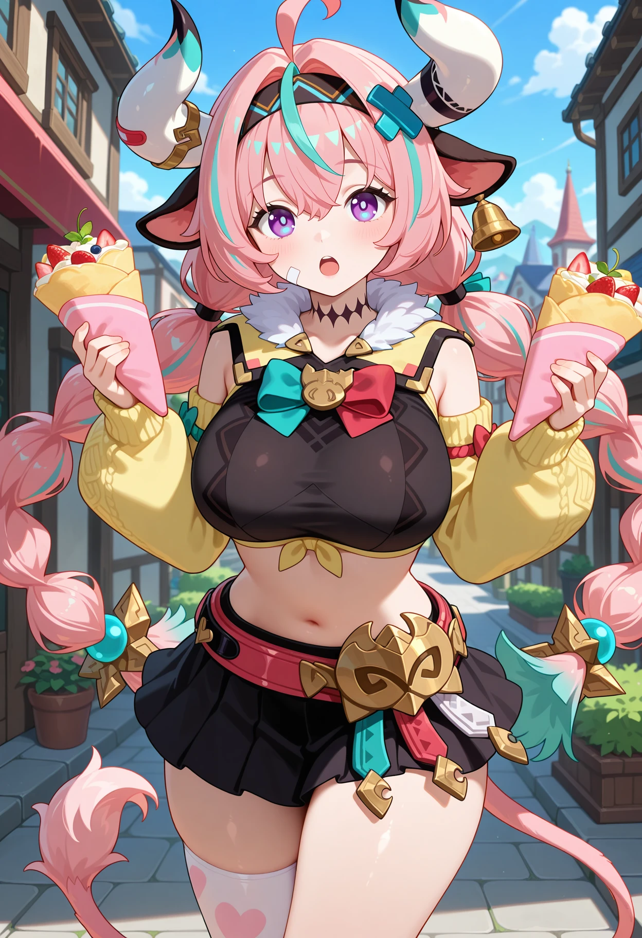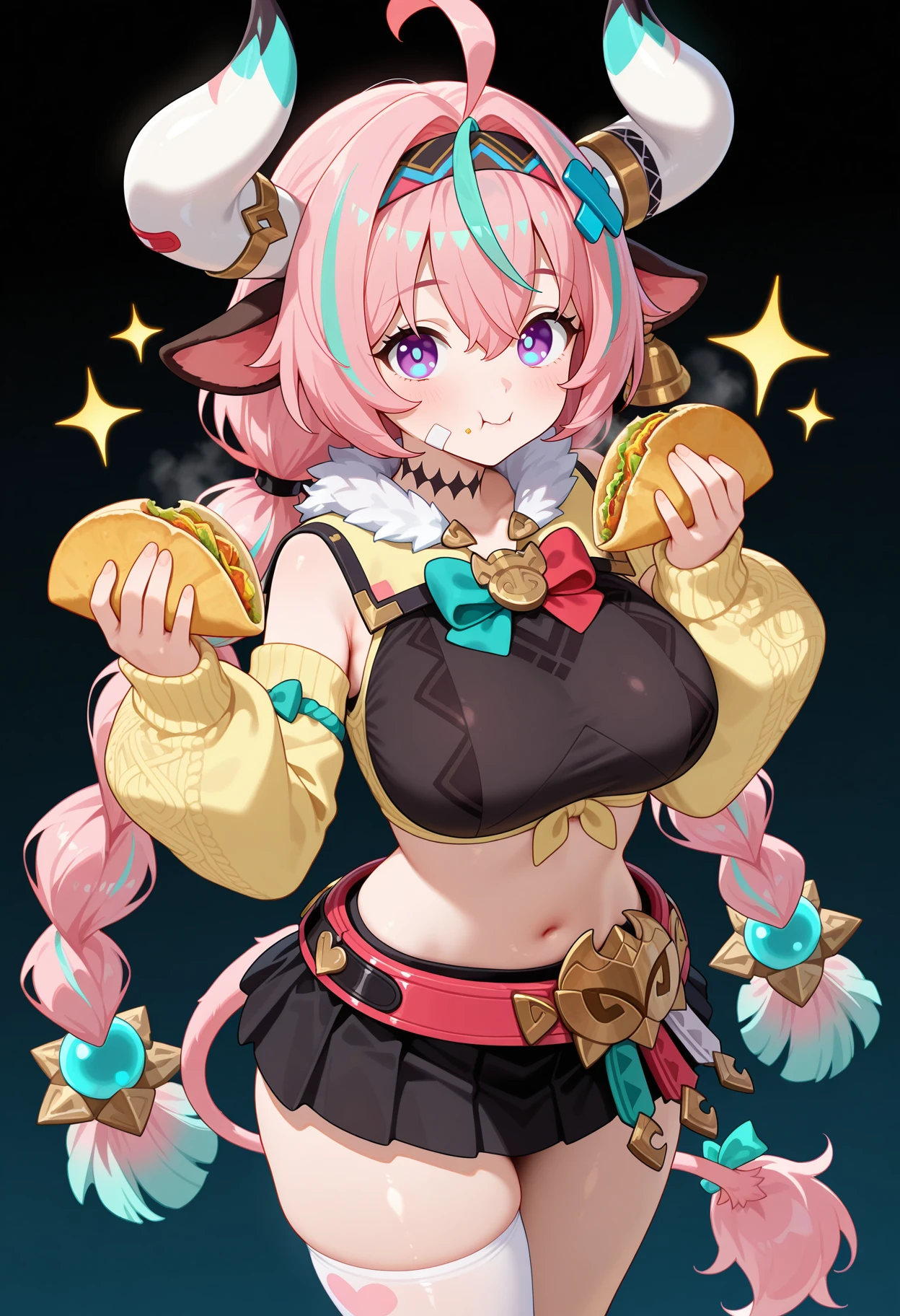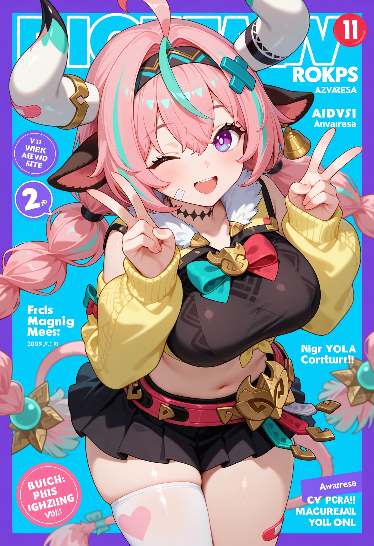 outfit1aavaresa, long hair, pink hair, twin braids, horns, animal ears, hairband, hair ornament, bandaid on face, tail, neck tattoo, crop top, black shirt, yellow jacket, detached sleeves, belt, black skirt, single thighhigh, white thighhighs