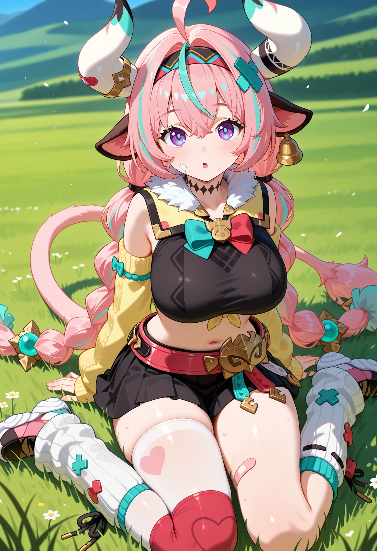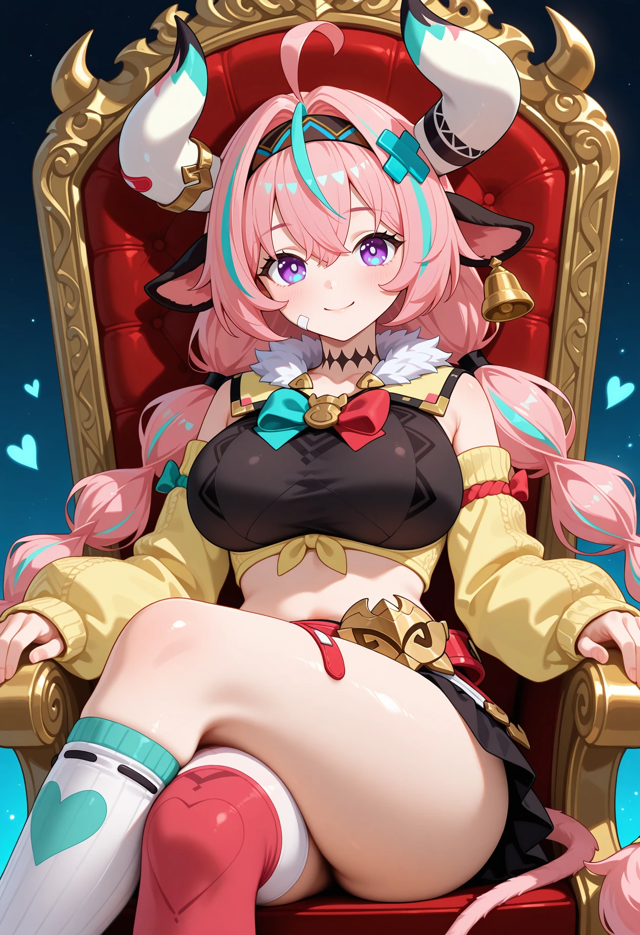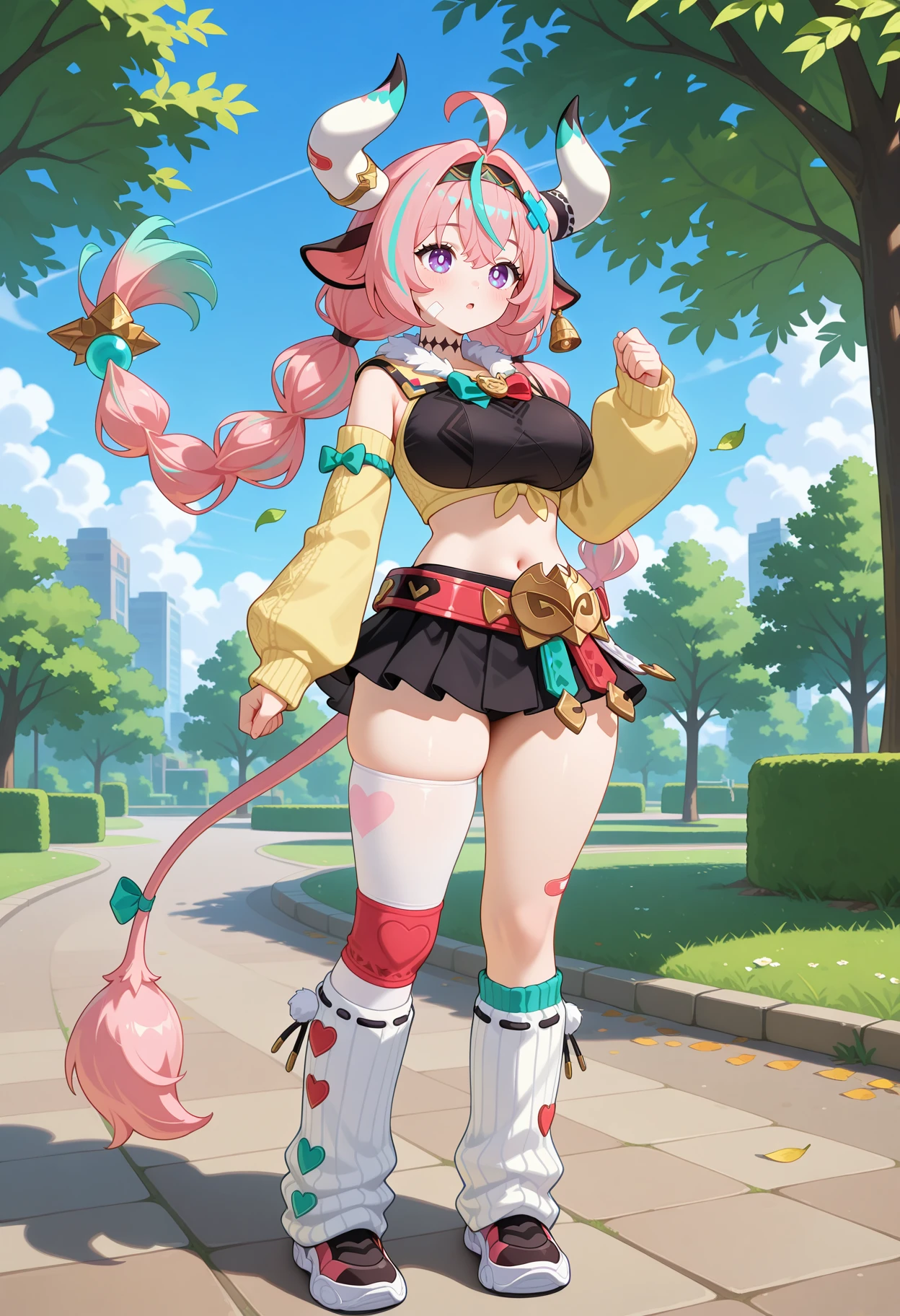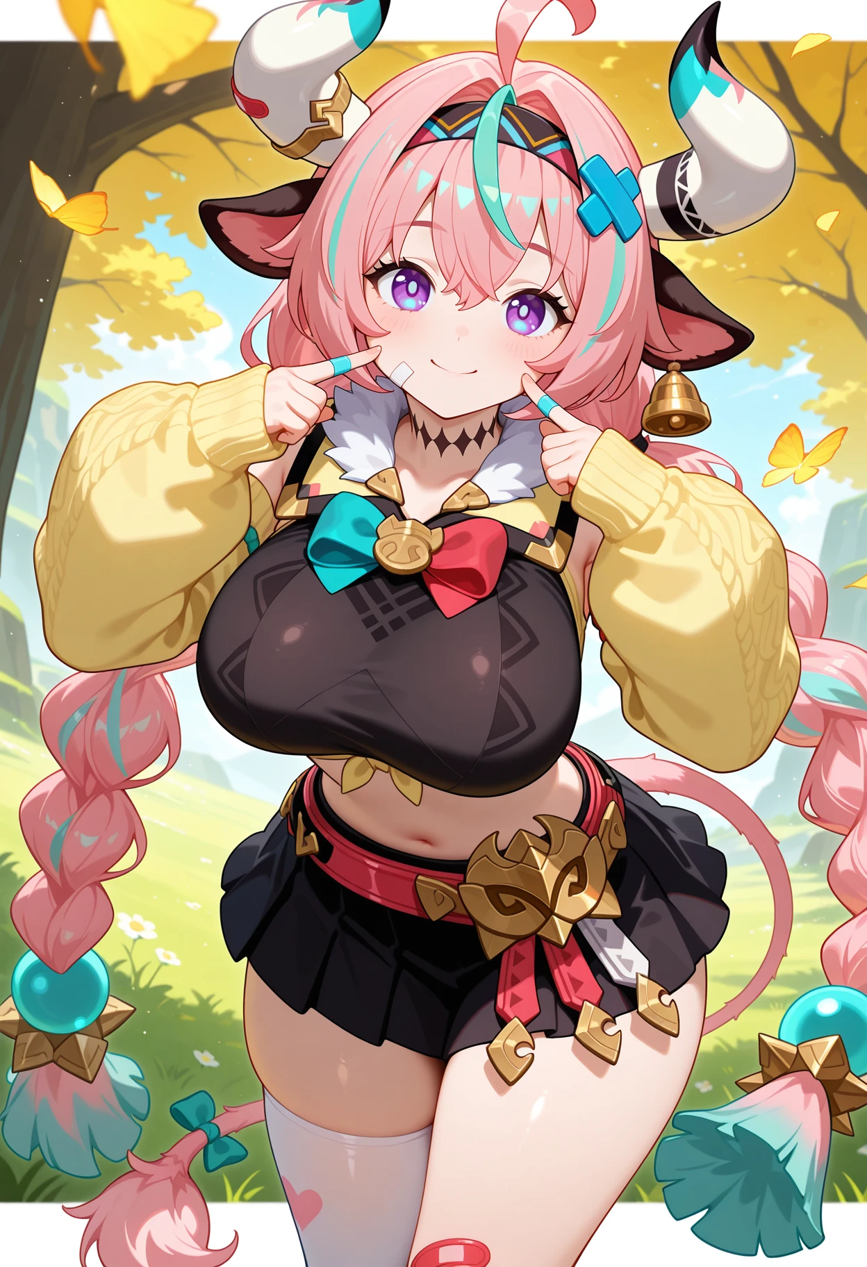 outfit1aavaresa, long hair, pink hair, twin braids, horns, animal ears, hairband, hair ornament, bandaid on face, tail, neck tattoo, crop top, black shirt, yellow jacket, detached sleeves, belt, black skirt, single thighhigh, white thighhighs