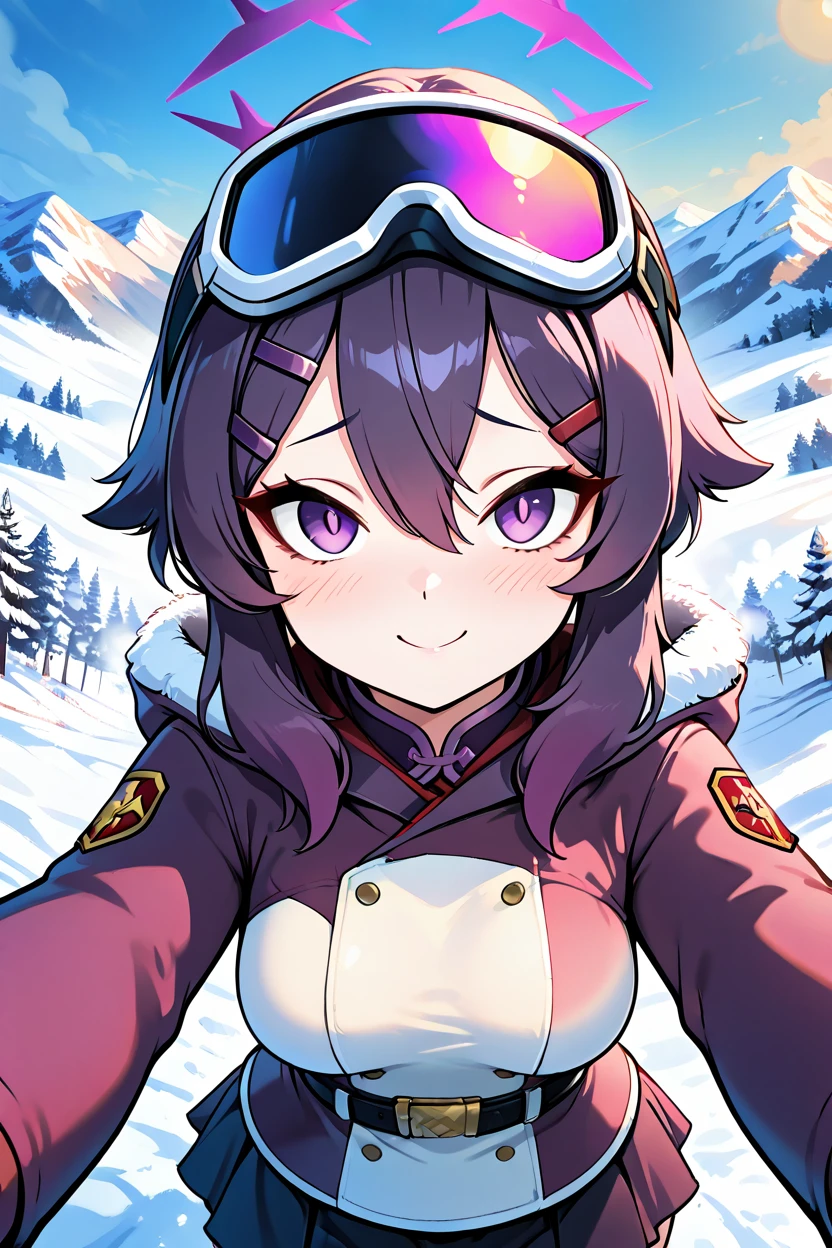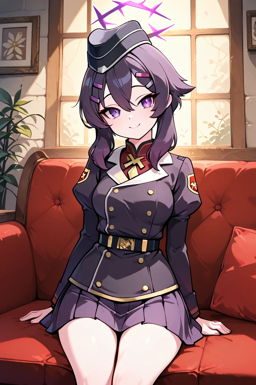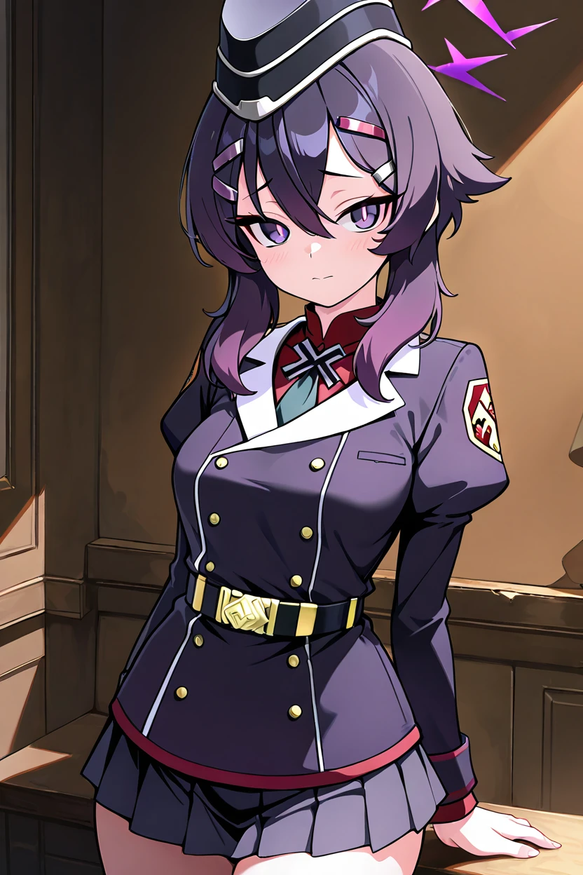 zzHaruka, Haruka (blue archive), purple eyes, purple hair, medium hair, halo, hairclip, purple halo, hat, black skirt, garrison cap, juliet sleeves, black jacket, pleated skirt,