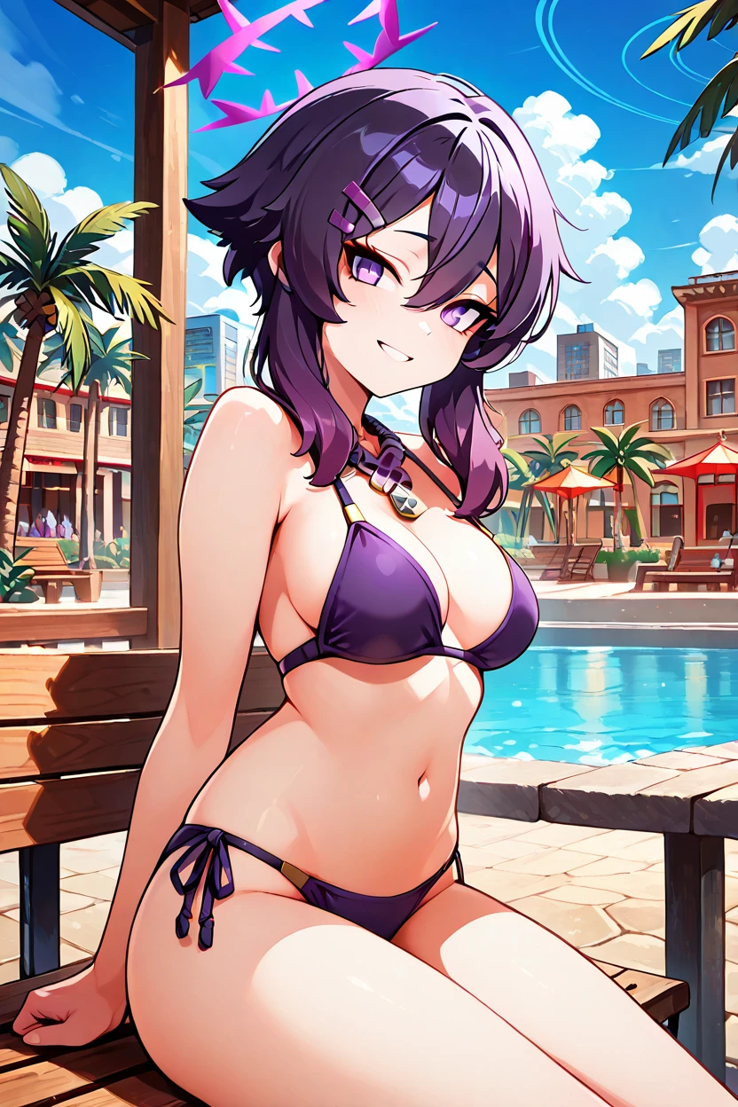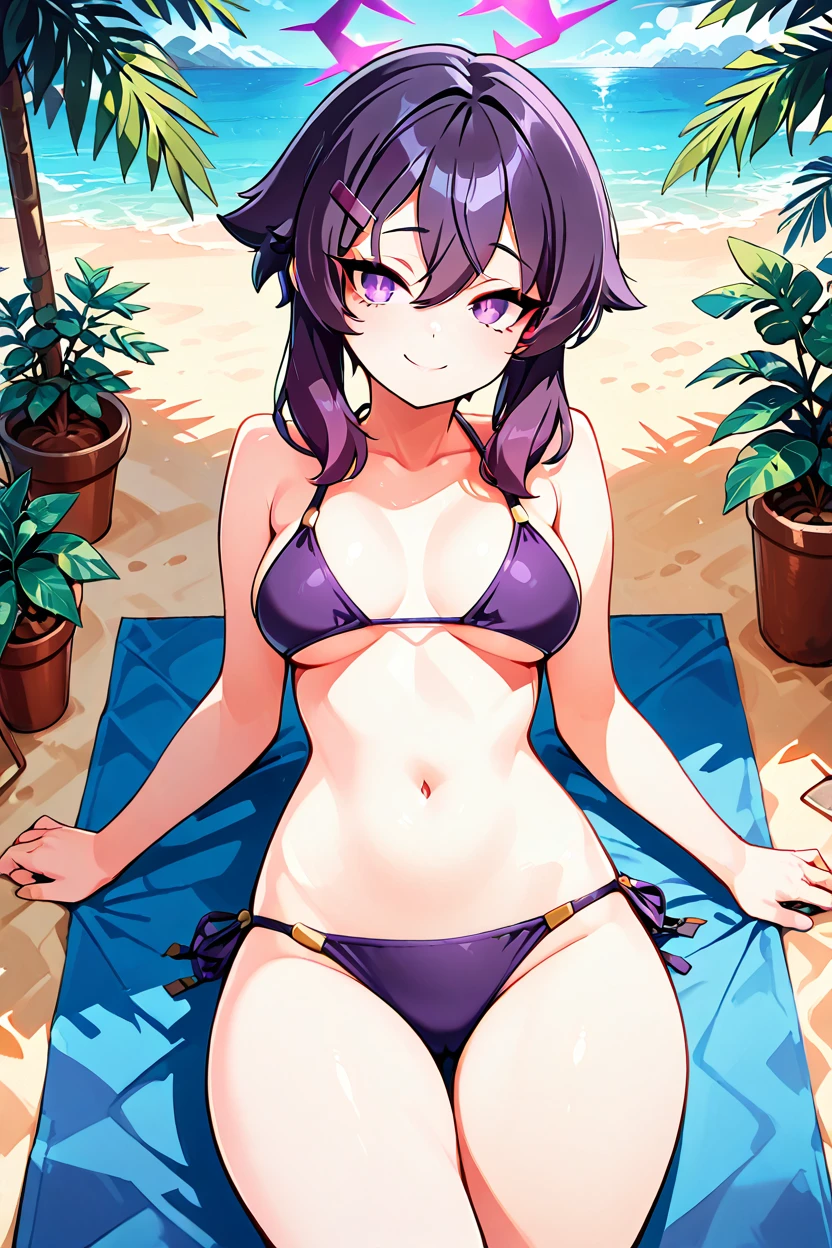 zzHaruka, Haruka (blue archive), purple eyes, purple hair, medium hair, halo, hairclip, purple halo,
