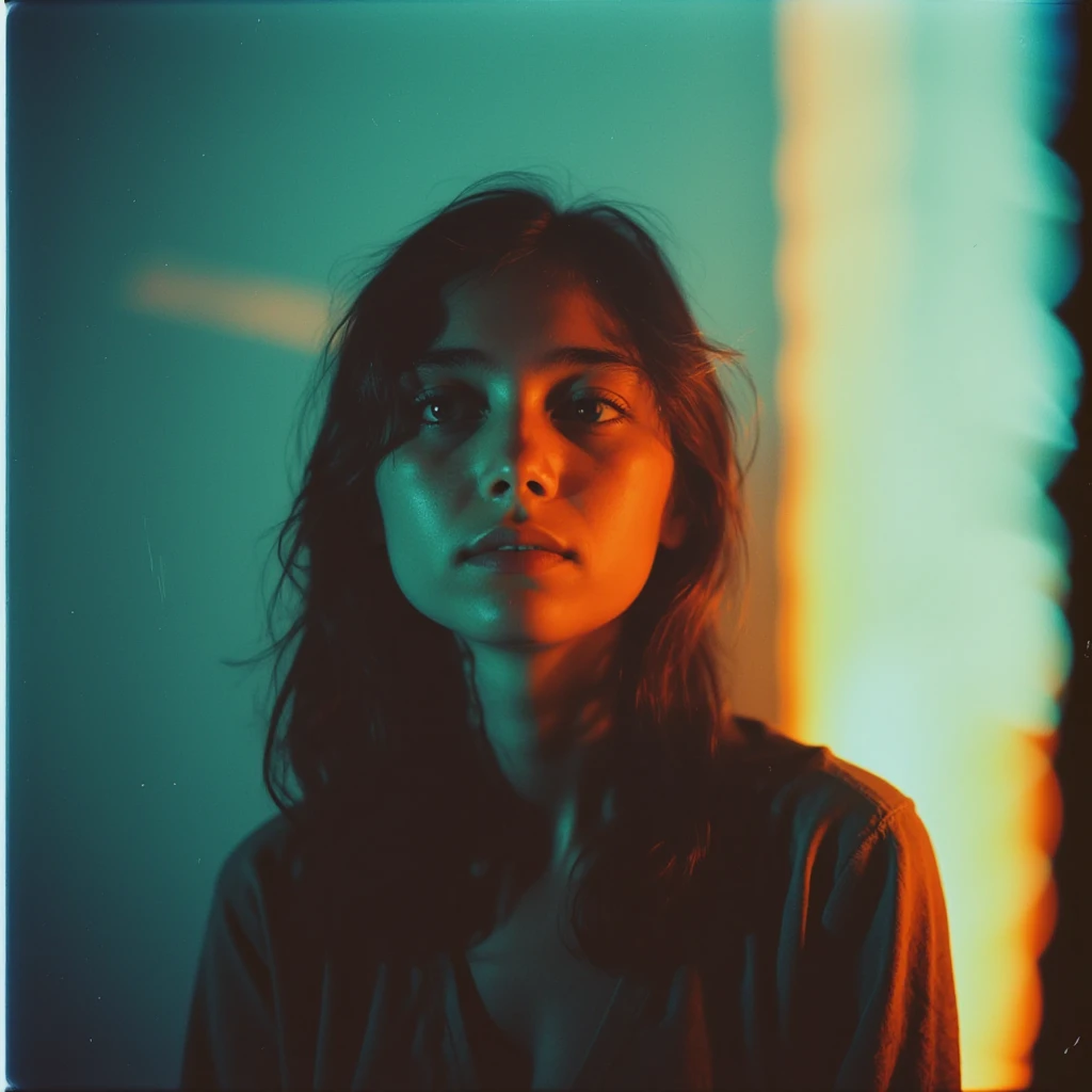 A minimal photo of (subject) neon (colors) details in the background, dramatic lighting, soft light, light projection in the background, grain, in the style of instant film, Ilford XP2 Super, color negative film, add noise, saturated image,Description