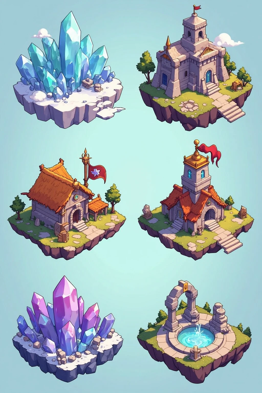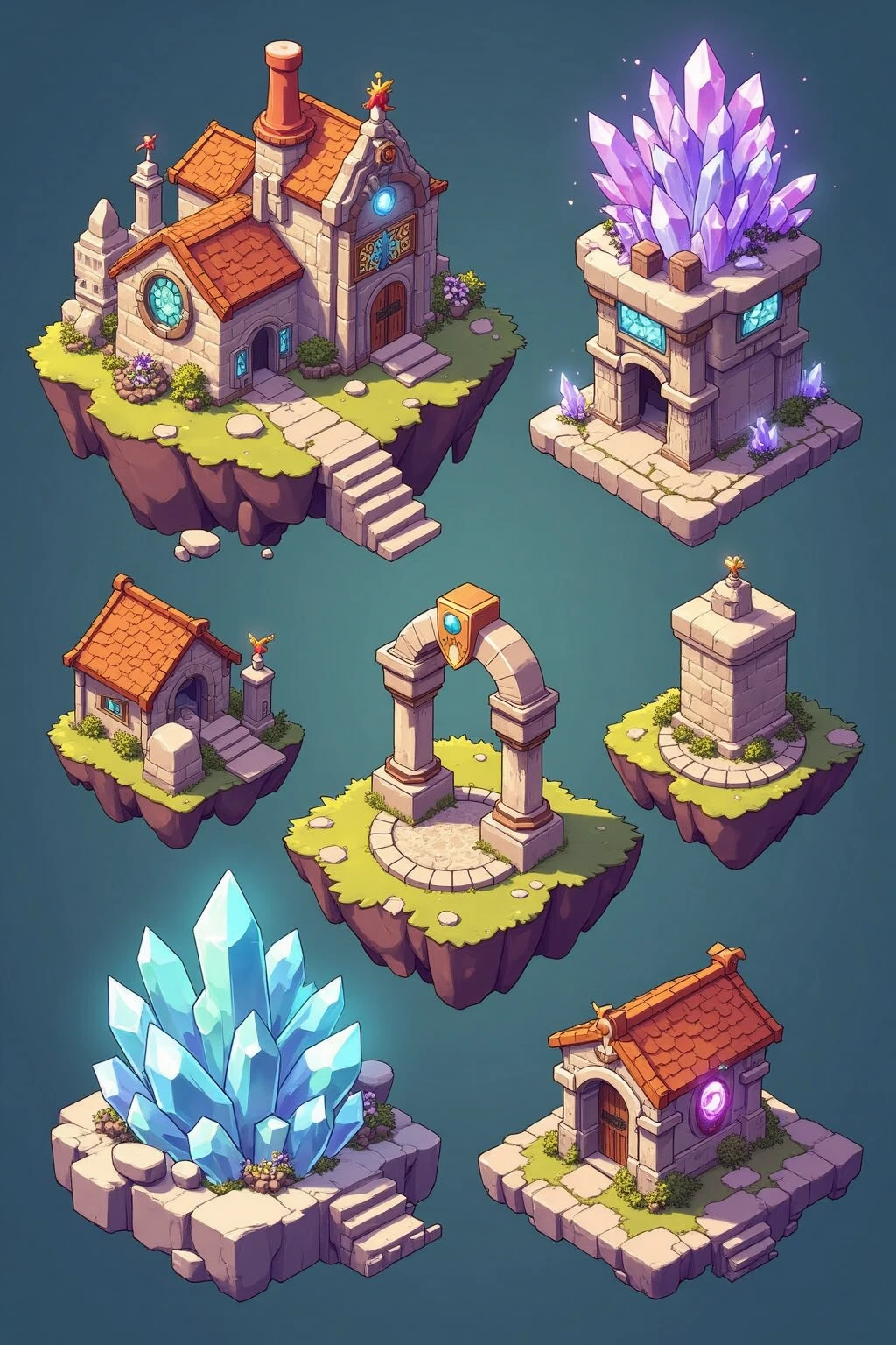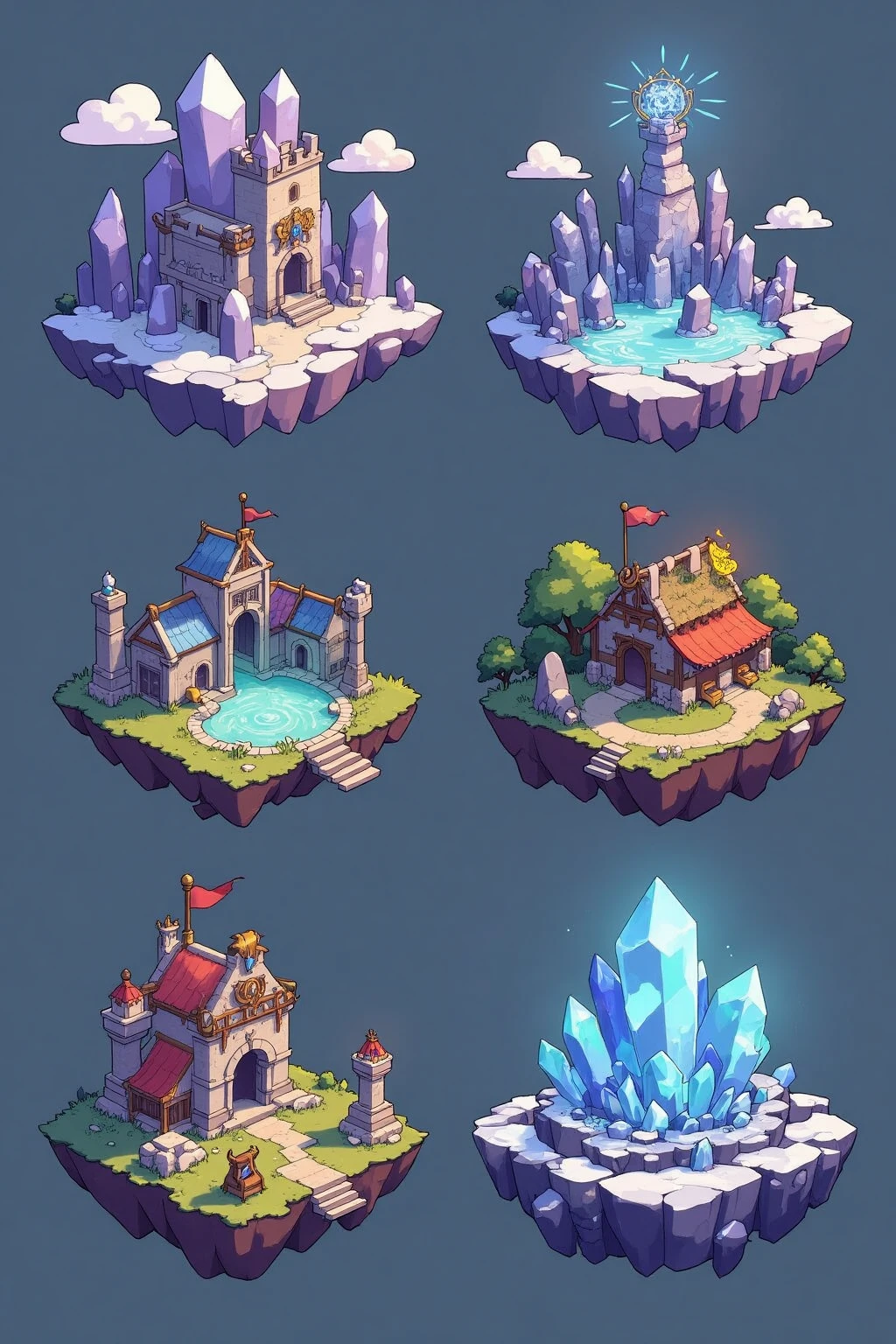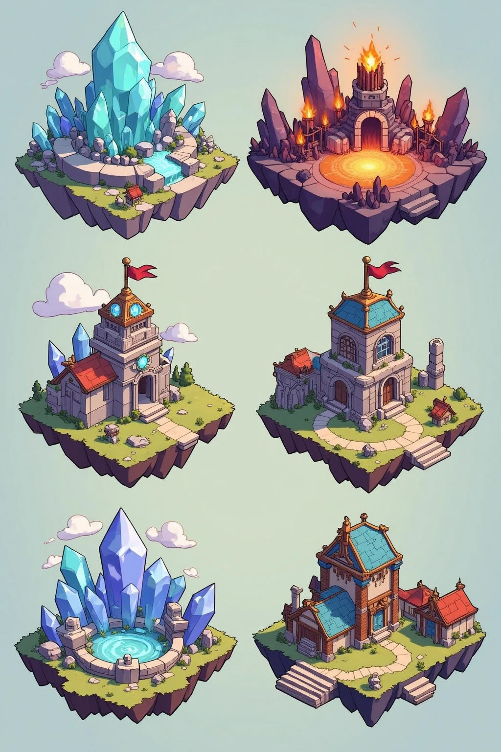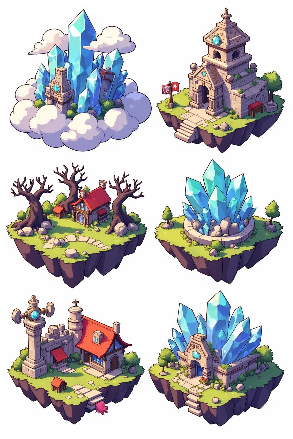 Isometric game scene elements, such as cloud - top palaces, haunted forests with twisted trees, and crystal - based workshops, imaginative designs.