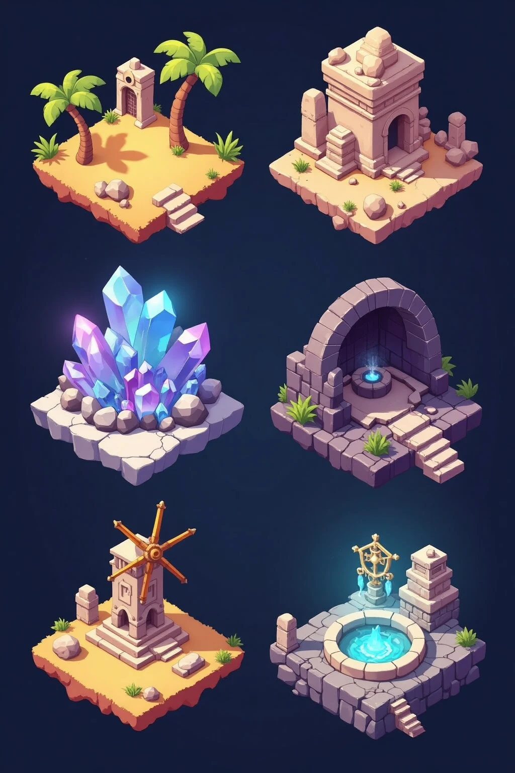 Isometric game scene elements, featuring desert oases with palm trees, dark crypts with tombstones, and crystal - powered mills, diverse settings.