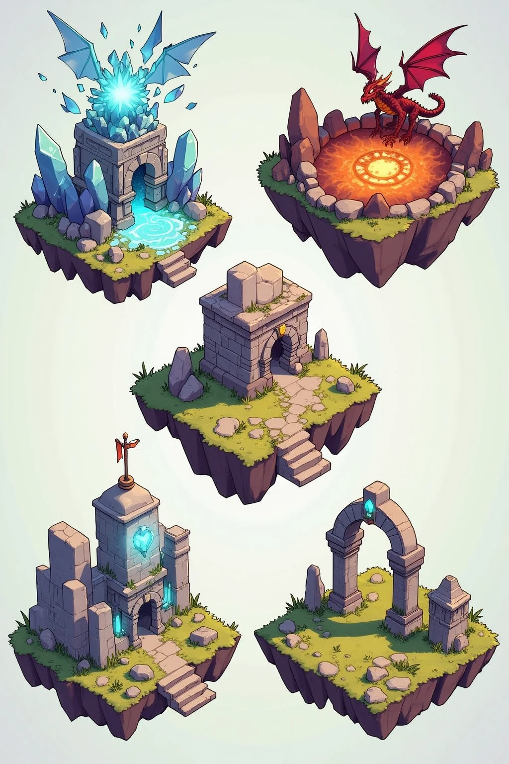 Isometric game scene elements, like magical towers with glowing runes, fiery dragon lairs, and grassy ruins with broken arches, fantasy style.