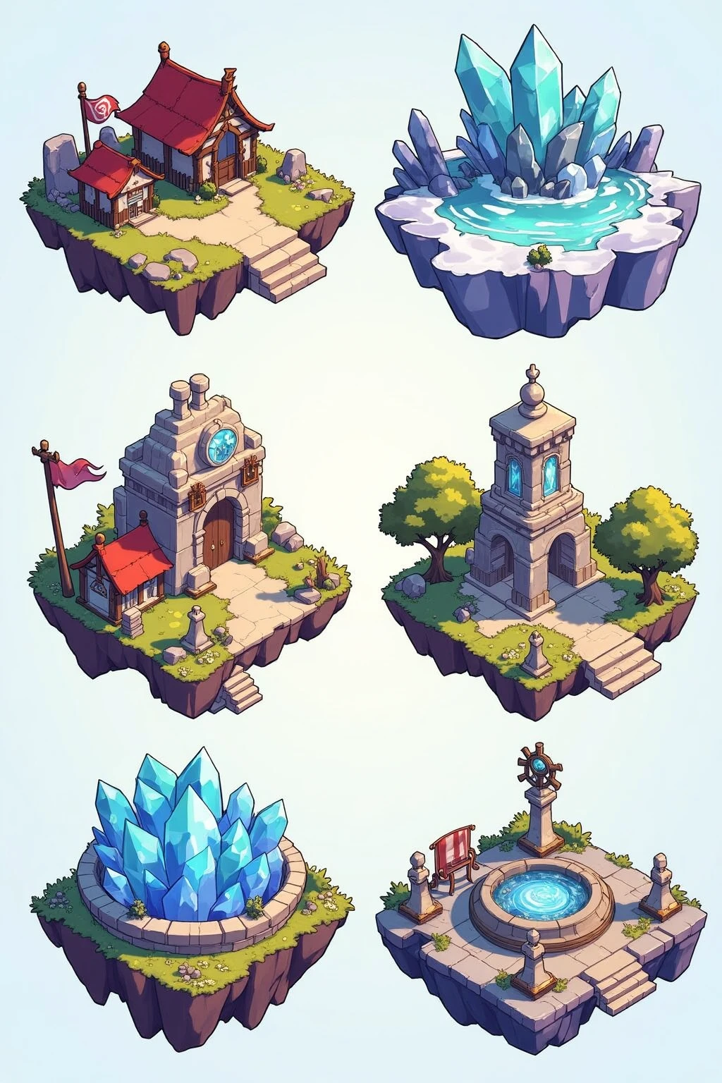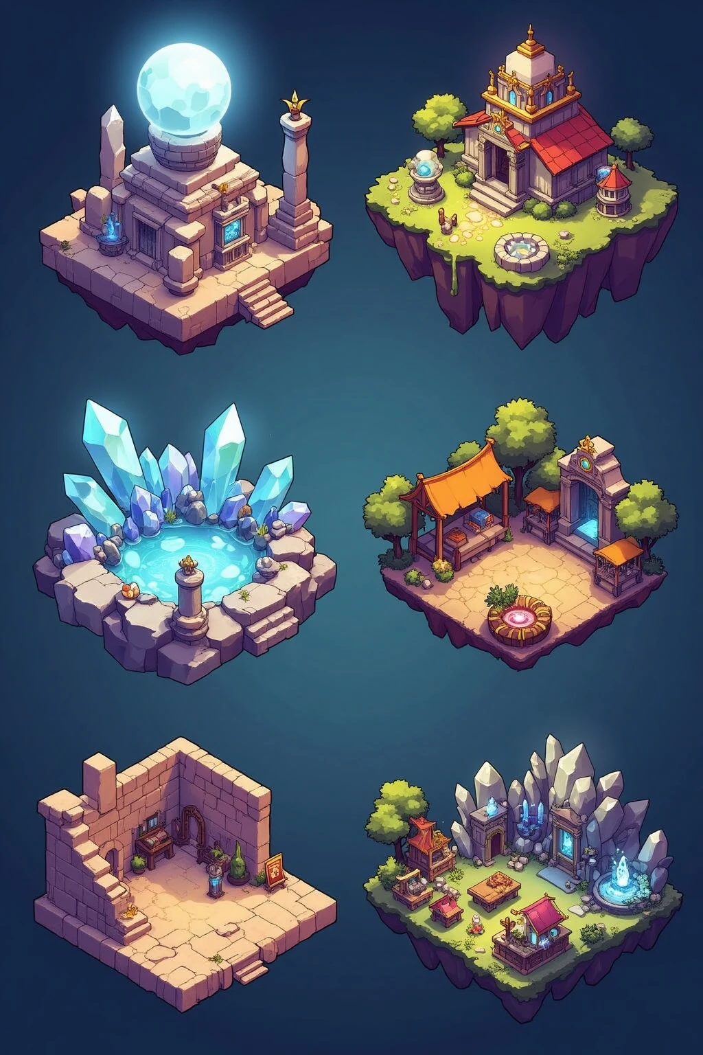 Isometric game scene elements, like pirate coves, arctic research stations, and crystal - centered gardens, distinct scenarios.