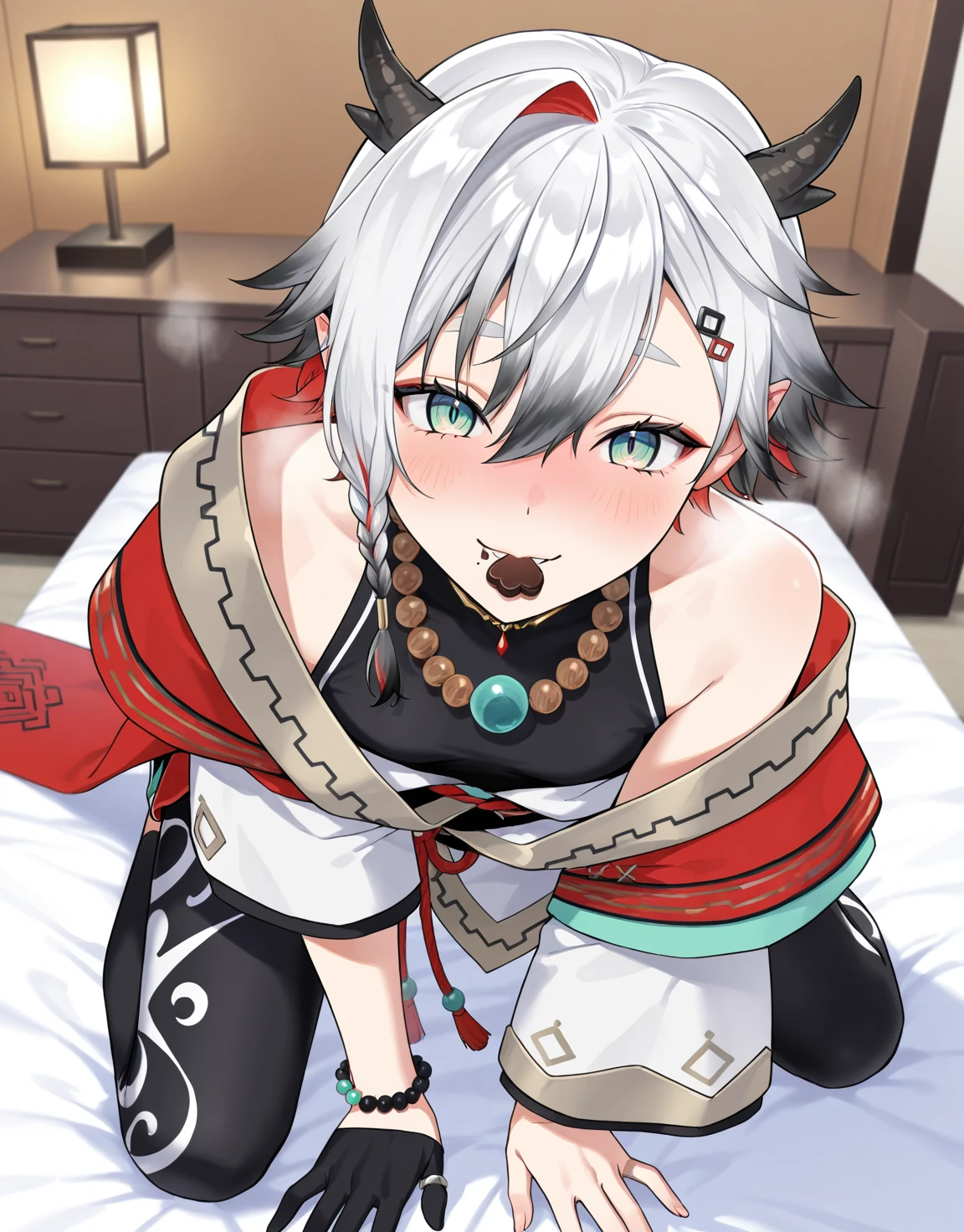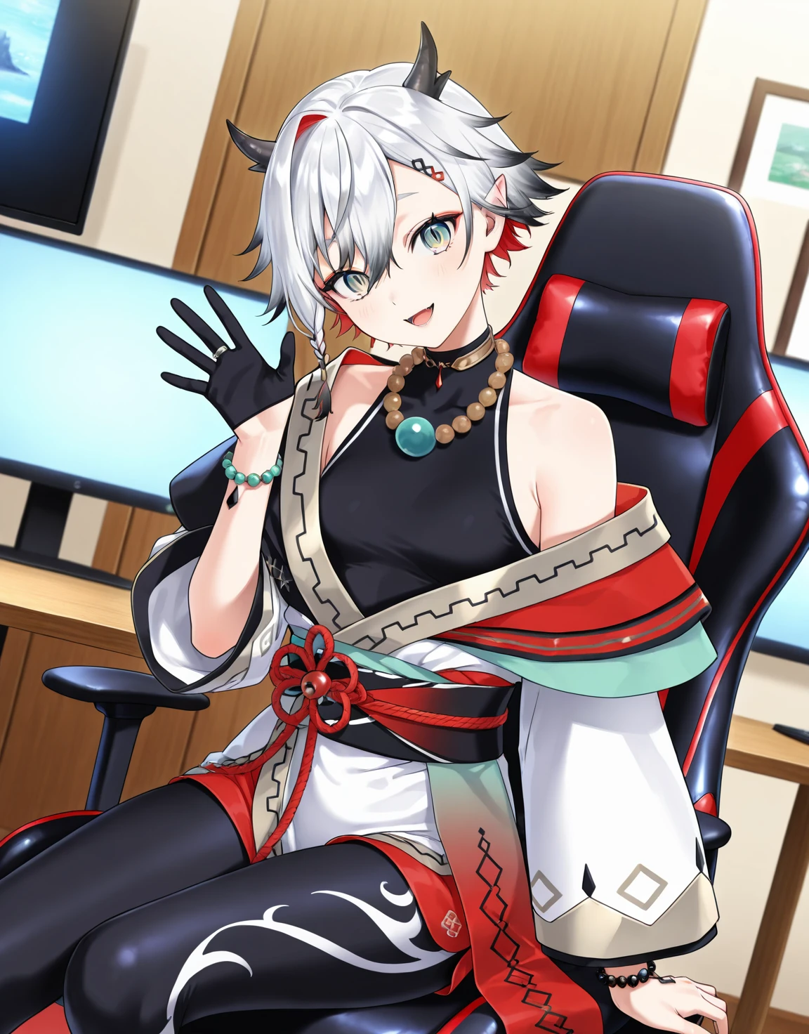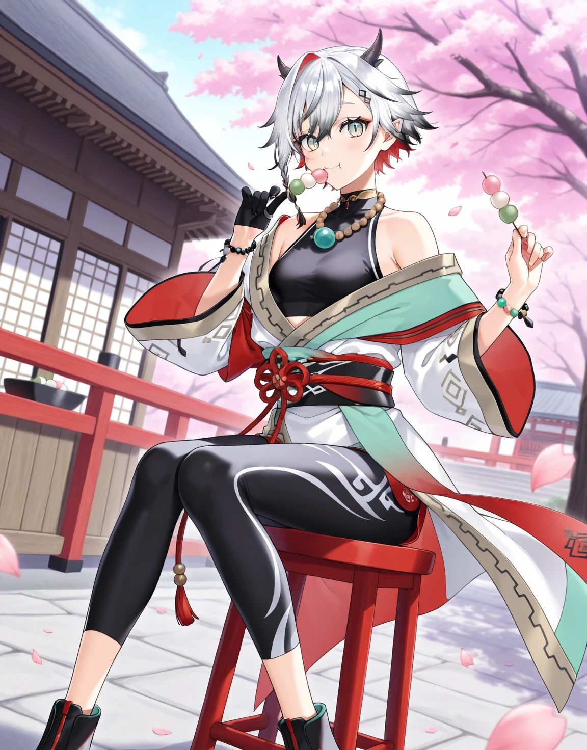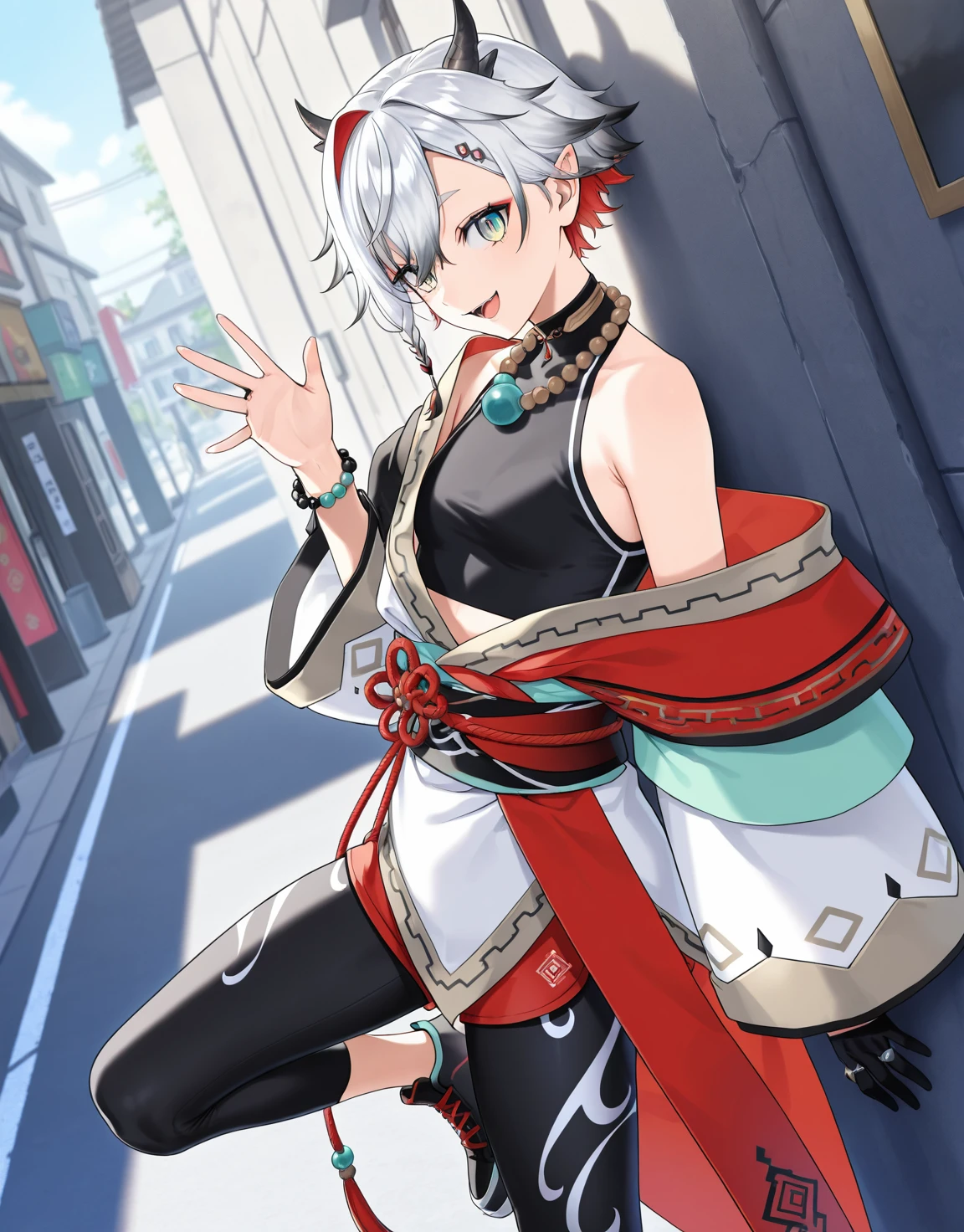Kamikado Agari, short hair, horns, pointy ears, side braid, prayer bead necklace, sleeveless tight shirt, happi, obi, single glove, bead bracelet, short shorts, leggings,