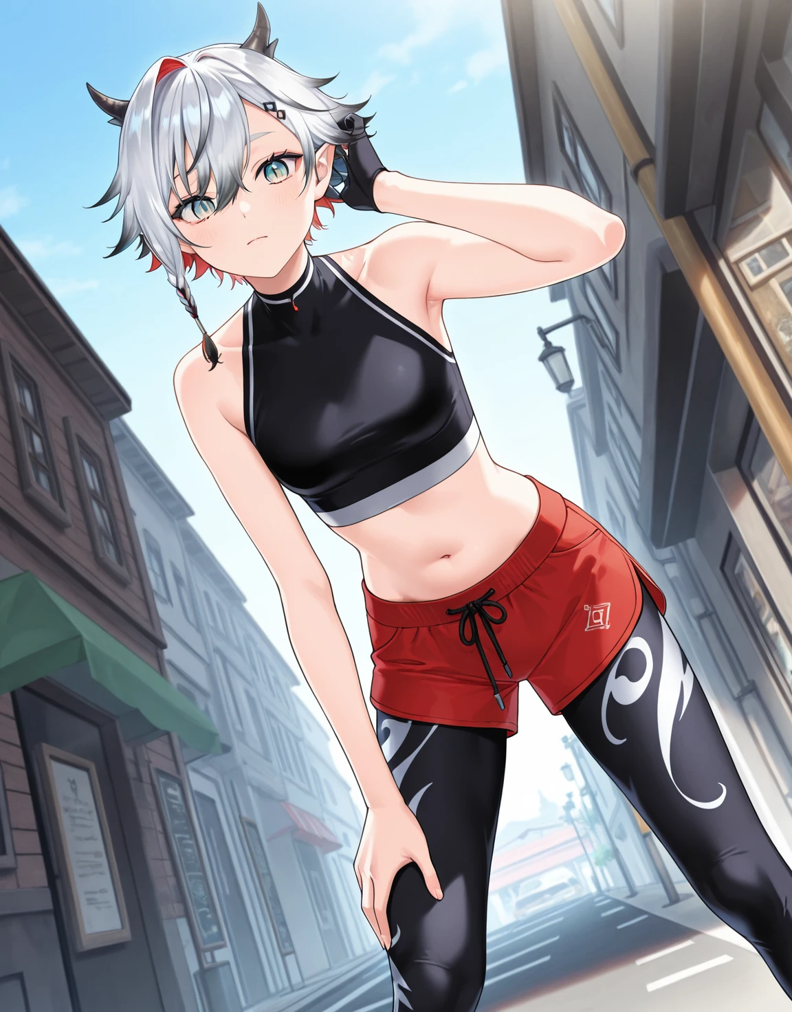 sleeveless tight shirt, single glove, bead bracelet, red short shorts, leggings, bare arms, stomach,