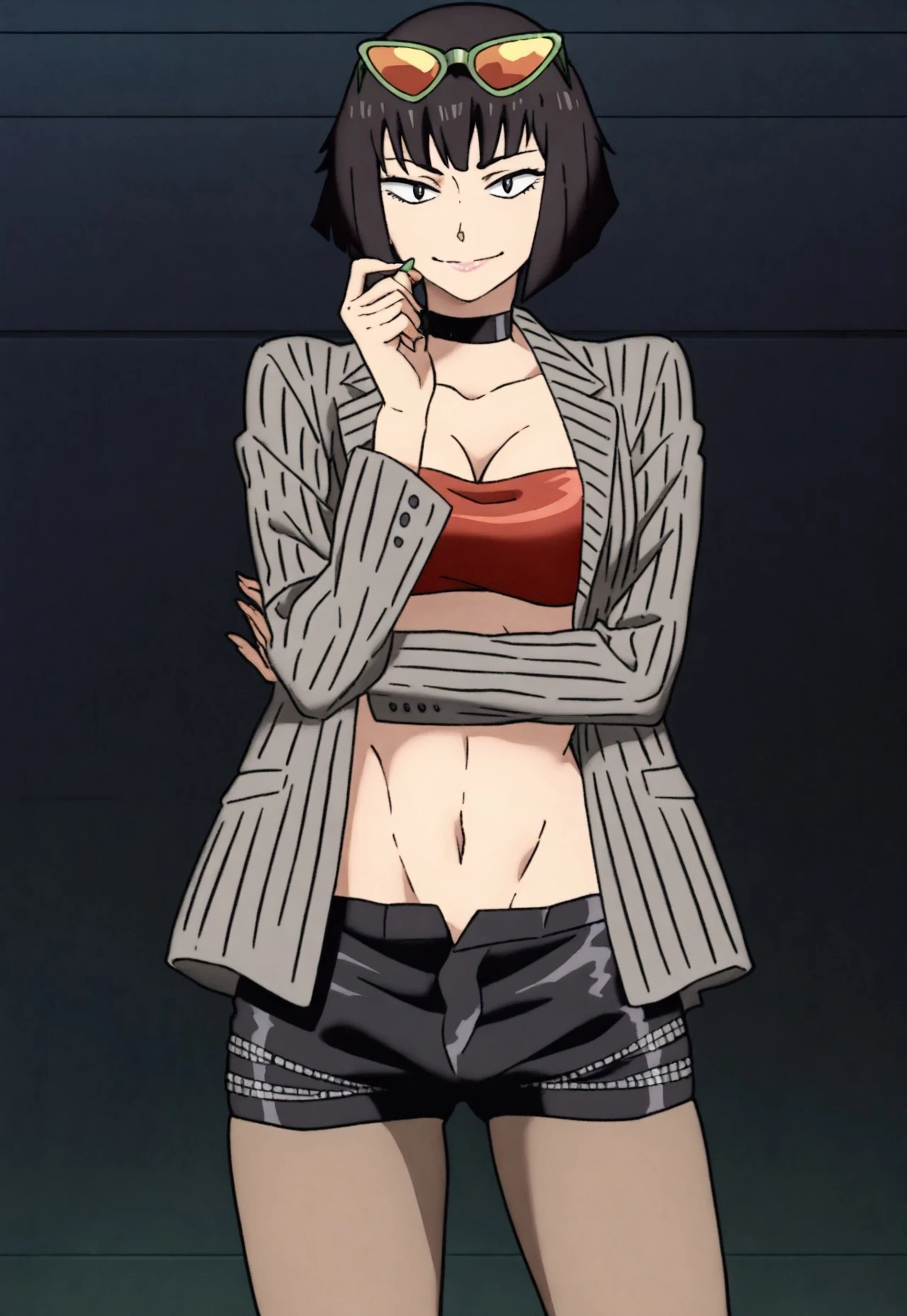 Obiguro, Obiguro (Sakamoto Days), Black hair, short hair, black eyes, sunglasses, eyewear on head, choker, gray jacket, open clothes, red tube top, midriff, naval, black shorts, pantyhose, black footwear