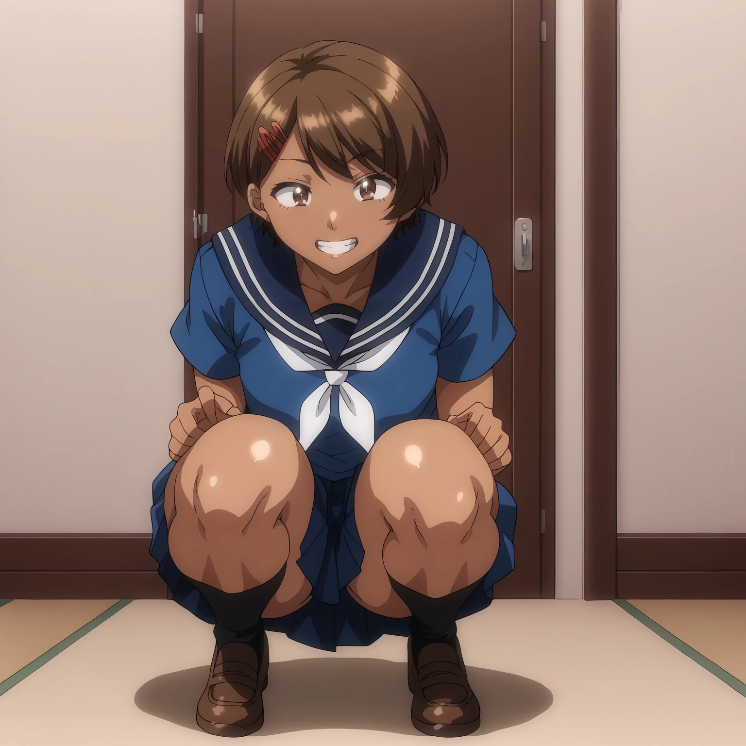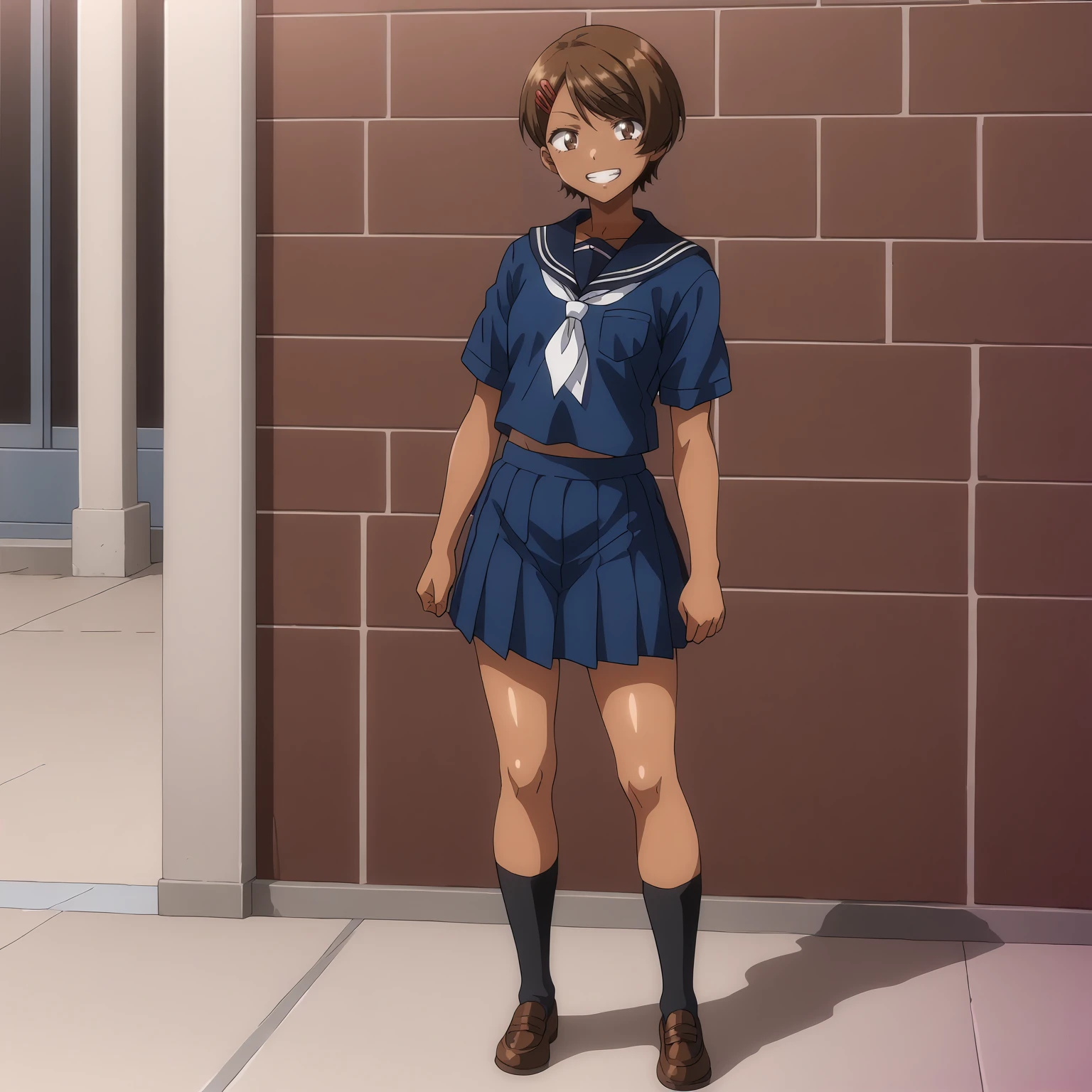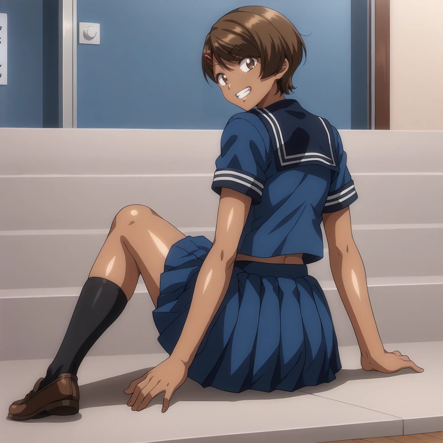 MioKatou,1girl,brown hair,short hair,hairclip,brown eyes,dark skin,