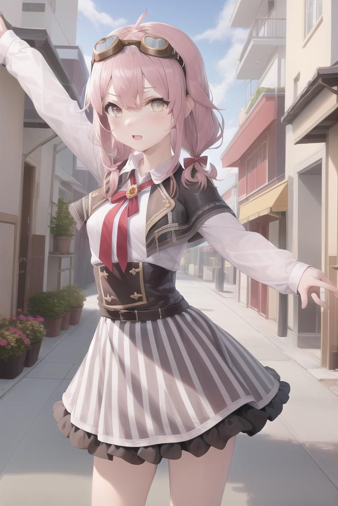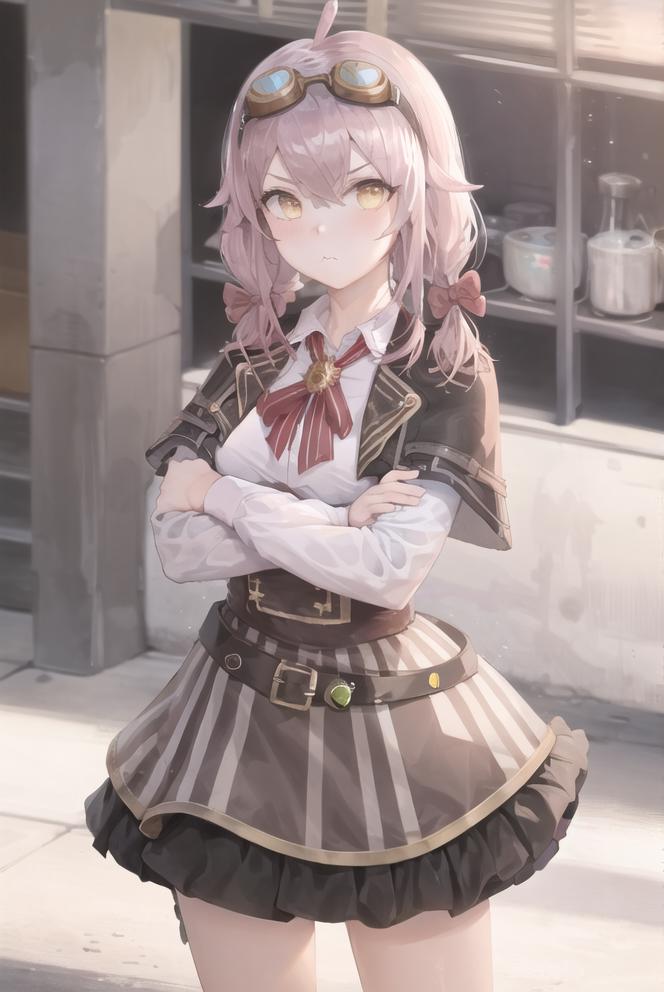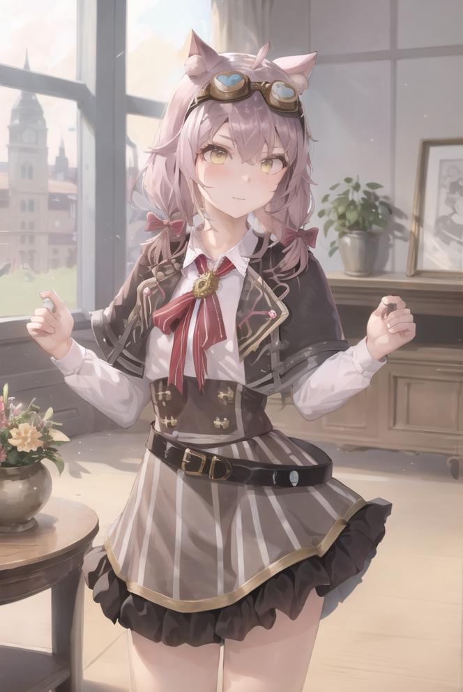 ace taffy,white shirt, skirt, bow,goggles,capelet