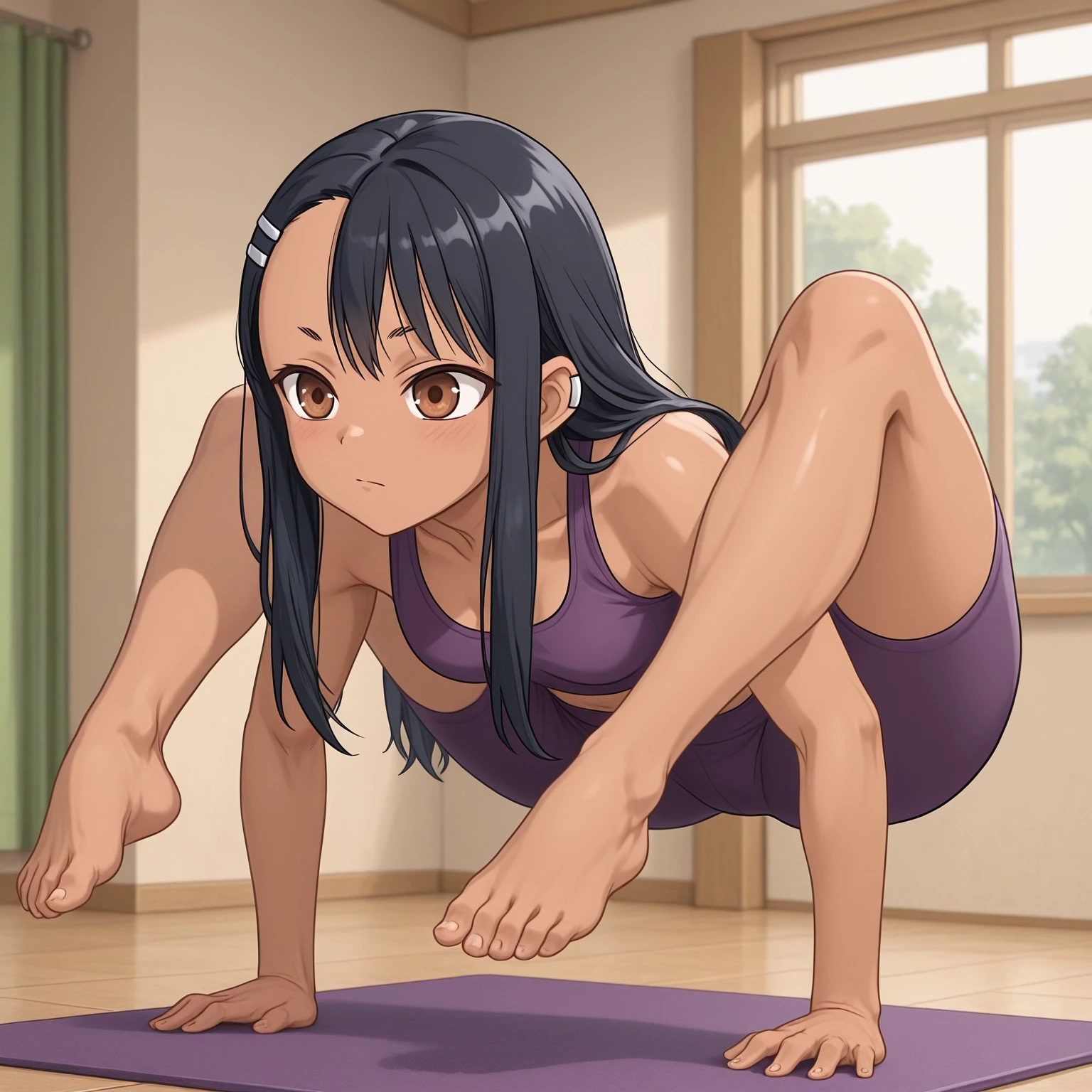 arm balance, yoga pose, firefly pose, legs over shoulders, lifted feet, balancing on hands,