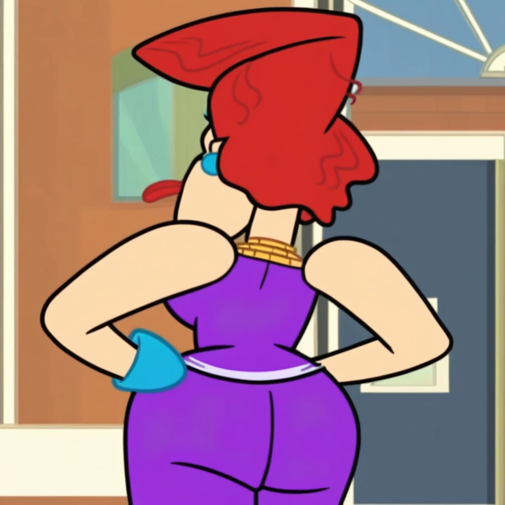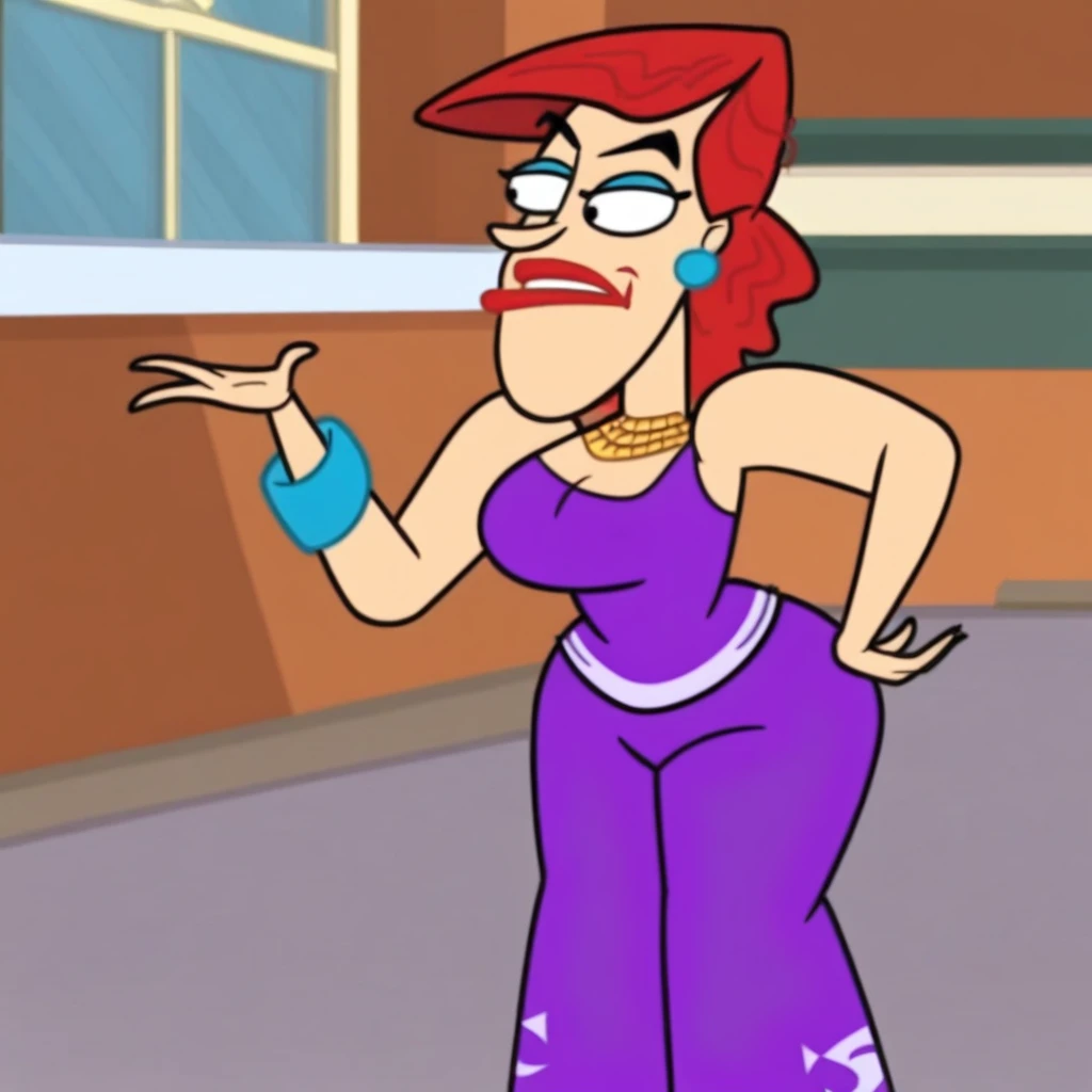 Cookie_Falc0ne, Red hair, red lips, blue earrings, golden necklace, purple tank top, purple pants,