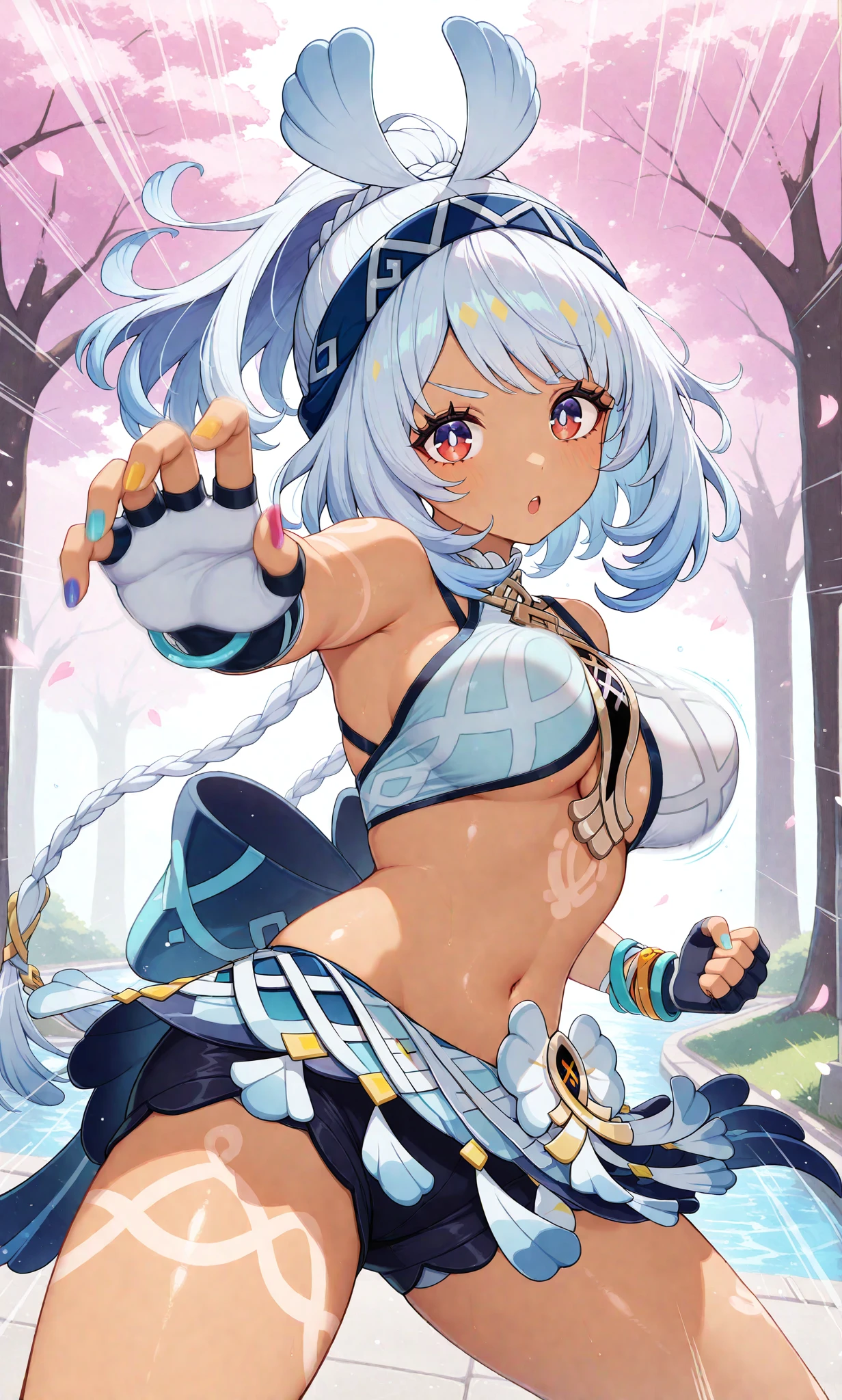 mualani (genshin impact), red eyes, white hair, long hair, ponytail, twin braids, dark skin, sidelocks, blue hairband