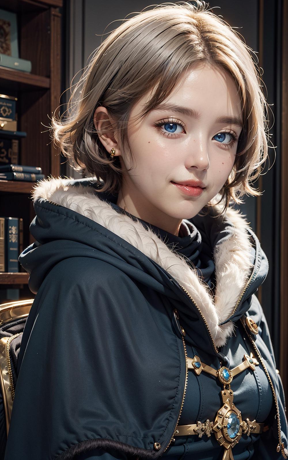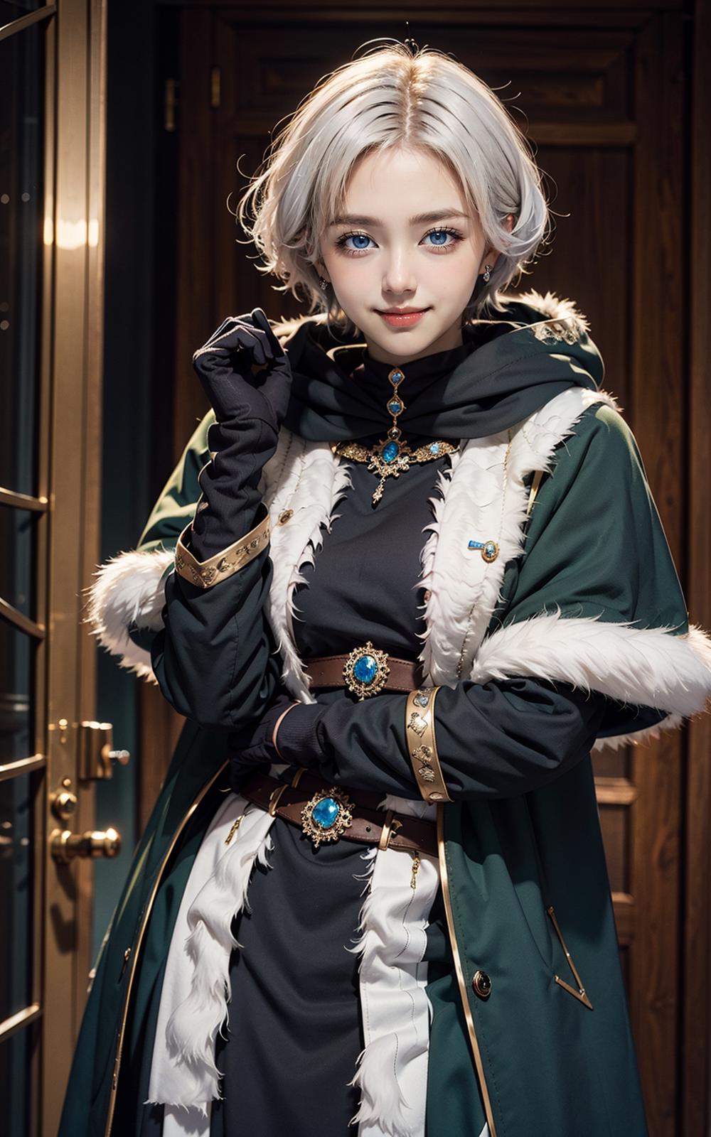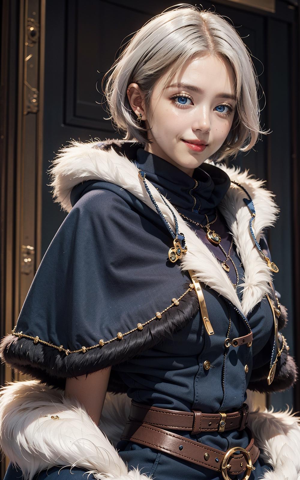 meteora osterreich,1girl, blue eyes, short hair, fur trim, hood, jewelry,capelet,white hair