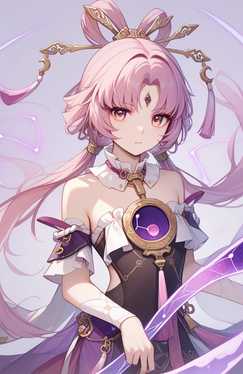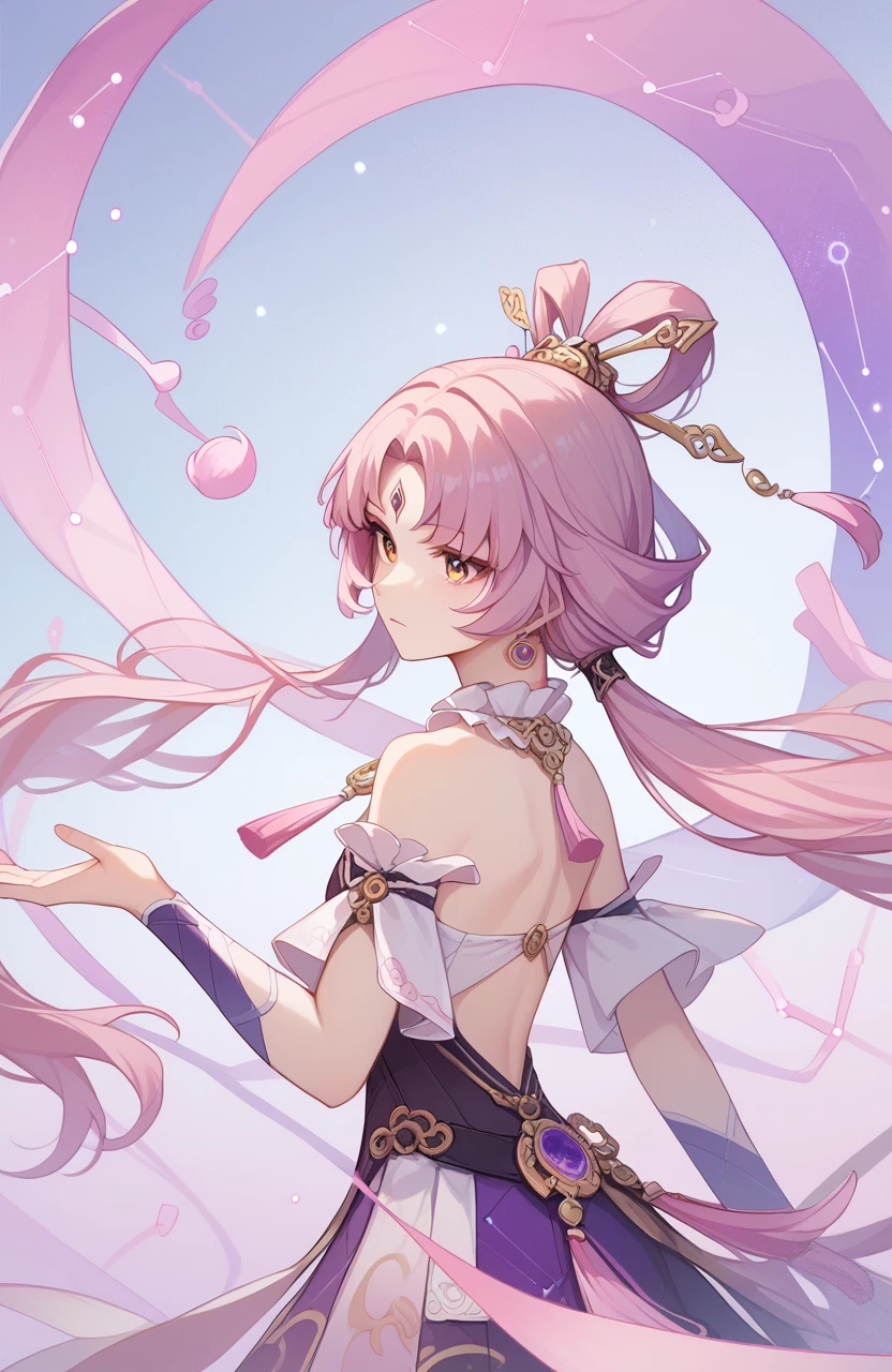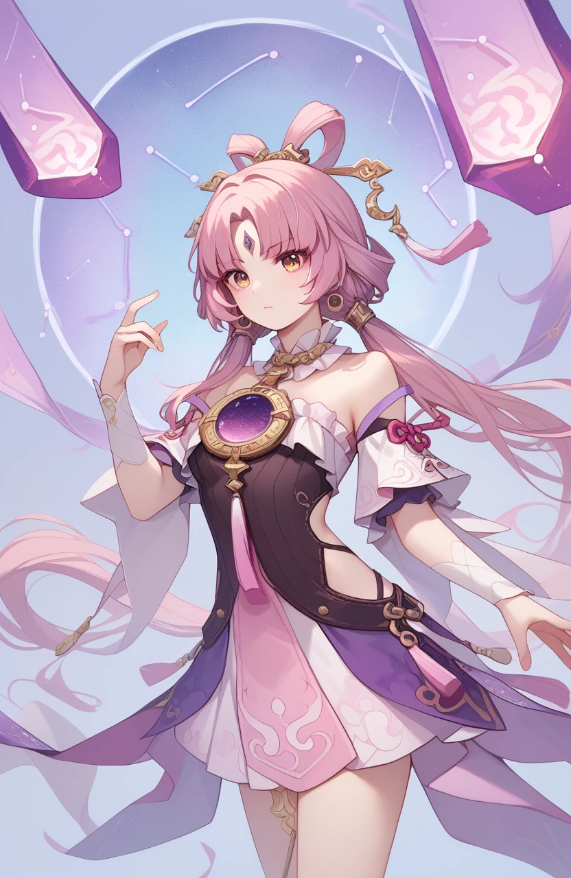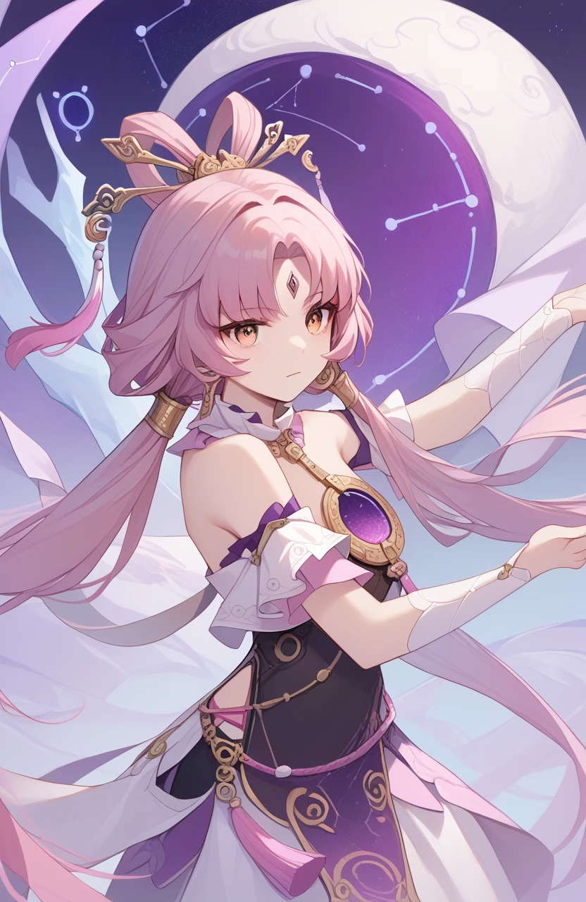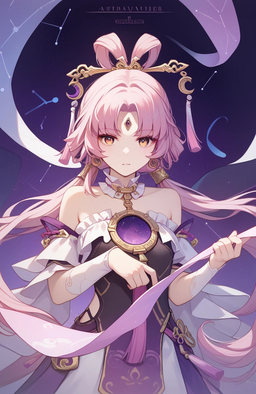 a girl named fuxuan,fuxuan,1girl,forehead jewel,low twintails,bare shoulders,detached sleeves,dress,tassel,constellation,jewelry,
