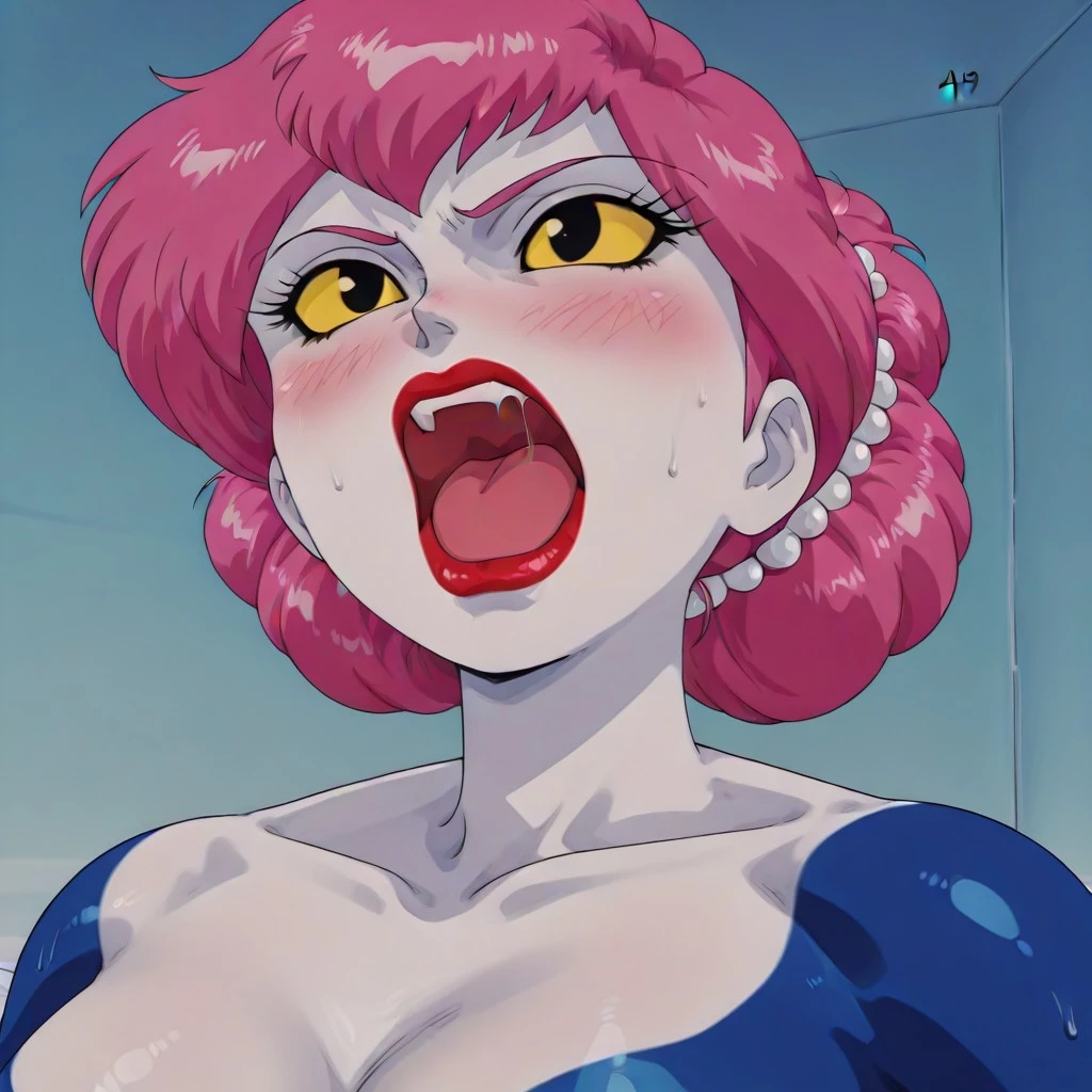 Kiss, blush, on a bed, , with a man, anime retro 90 style, blue skin mermaid tail, Blue skin ass, straight pink bun hair, , navel, pale white skin, thick long black eyelashes makeup, black eyes, white skin, blue skin arms, blue skin breasts, yellow sclera, mermaid, hair pearl accessories,