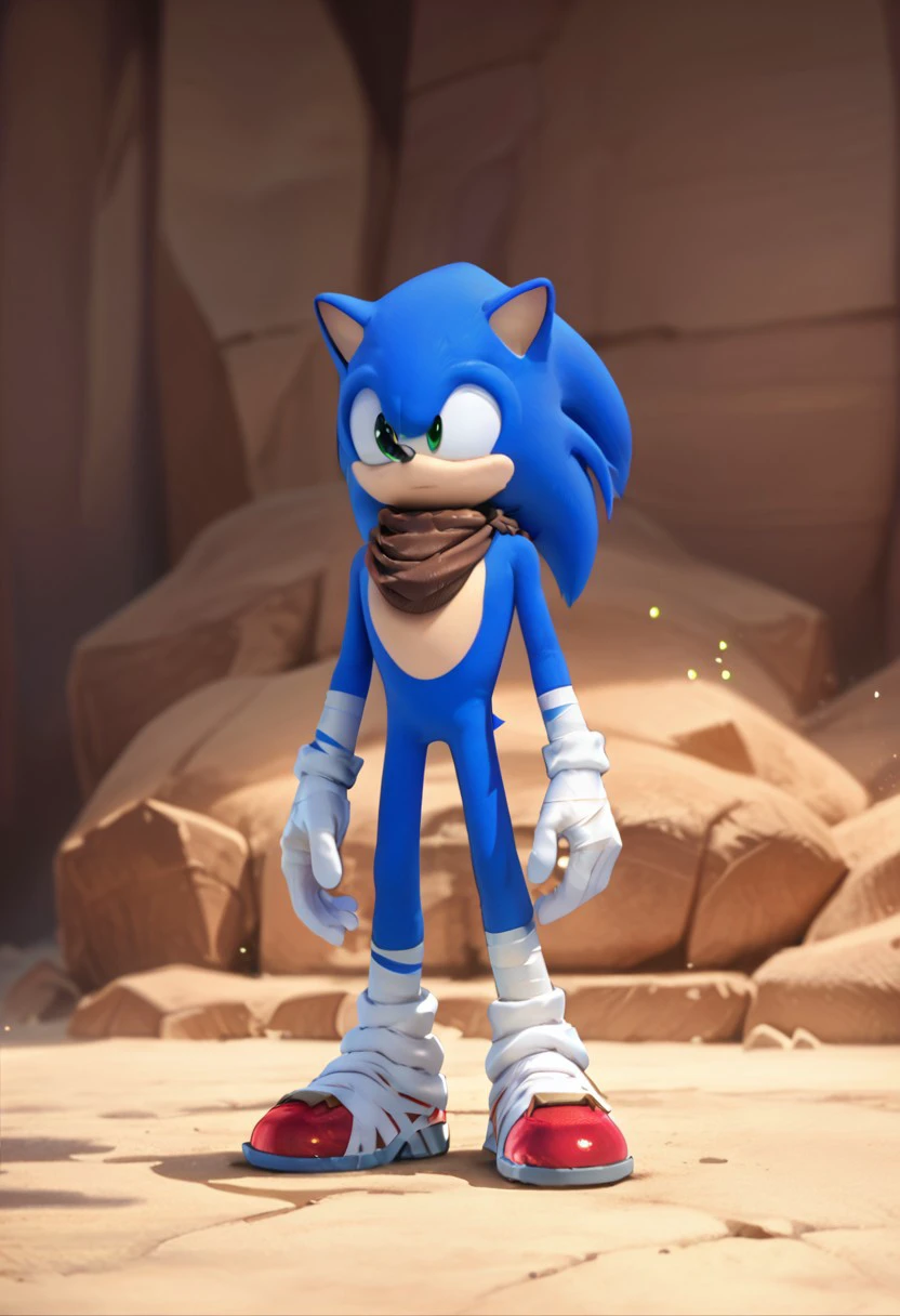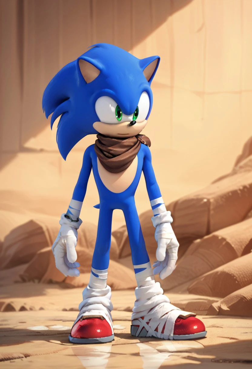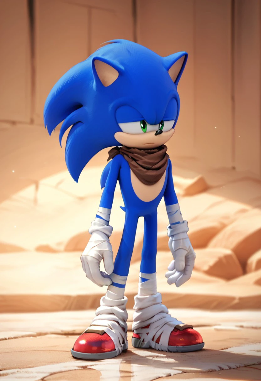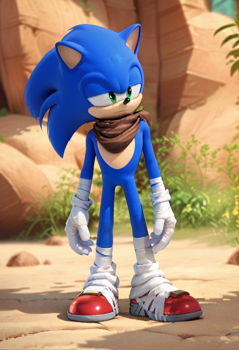 Sonic, furry male, blue fur, green eyes, brown scarf, white gloves, red shoes, white bandages