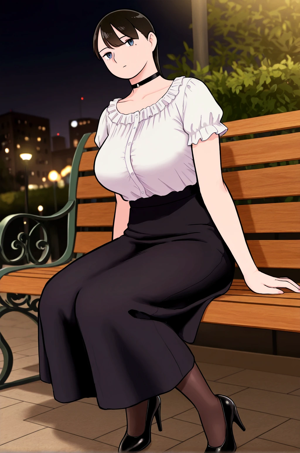 dress, shirt, frilled_shirt, short_sleeves, choker, black_skirt, long_skirt, pantyhose