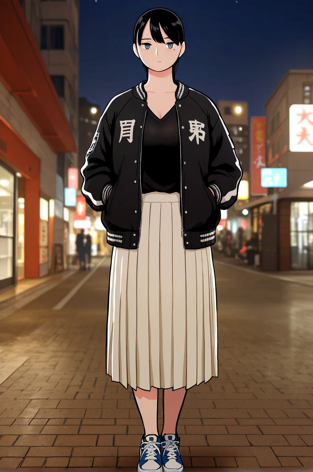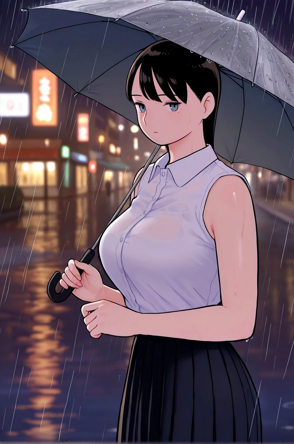 white_shirt, long_skirt, black_skirt, sleeveless_shirt, collared_shirt