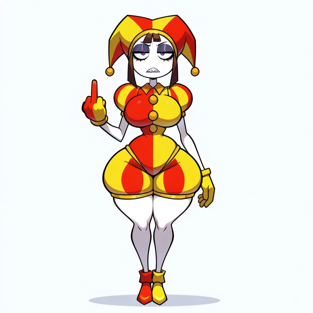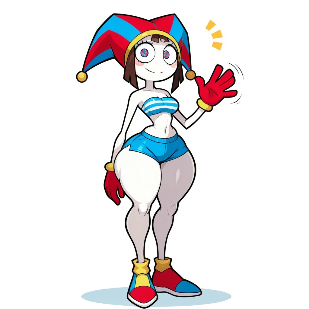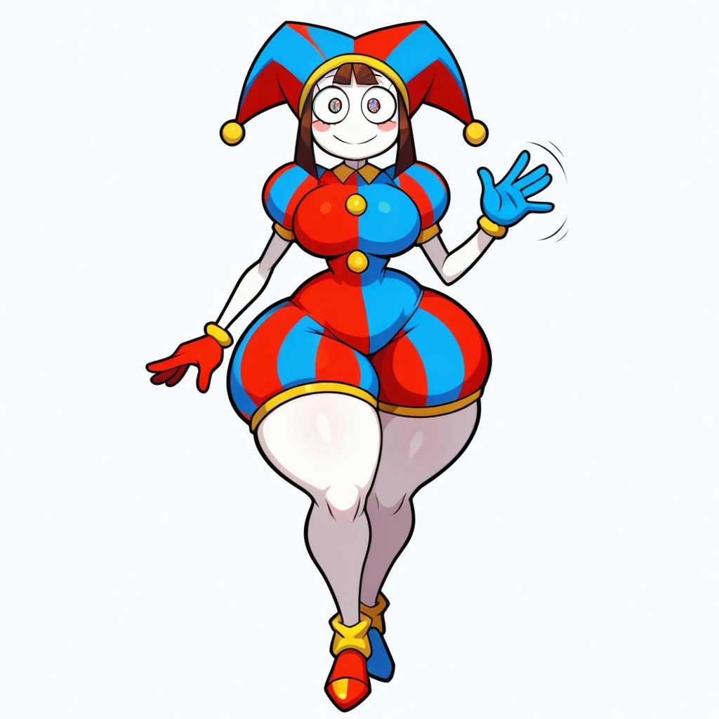 (blue-red jester outfit, puffy sleeves, puffy shorts, blue and red gloves, blue-red mismatched shoes)