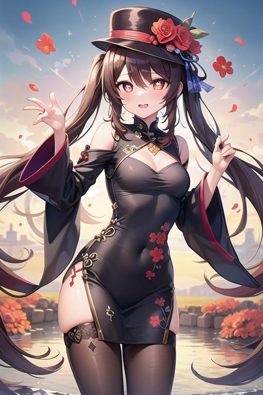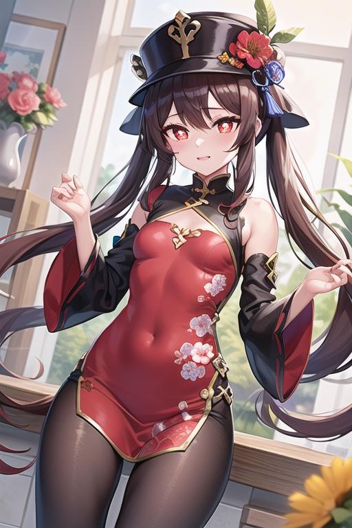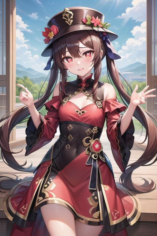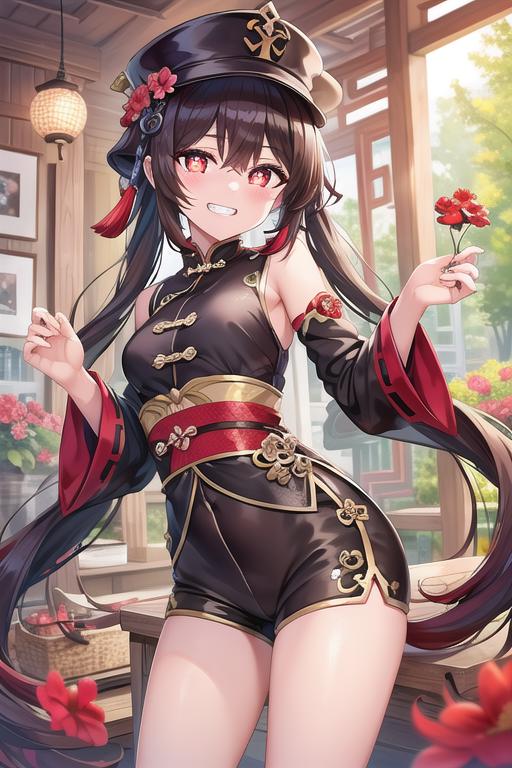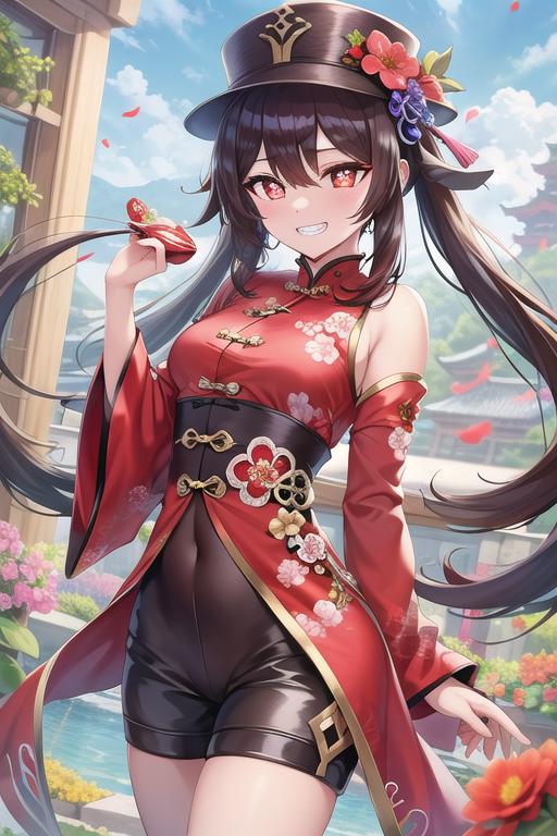 (HuTao/(GenshinImpact/)), red eyes, flower-shaped pupils, hat, long brown hair, bangs, twintails, chinese clothes, black shorts, wide sleeves, grin,