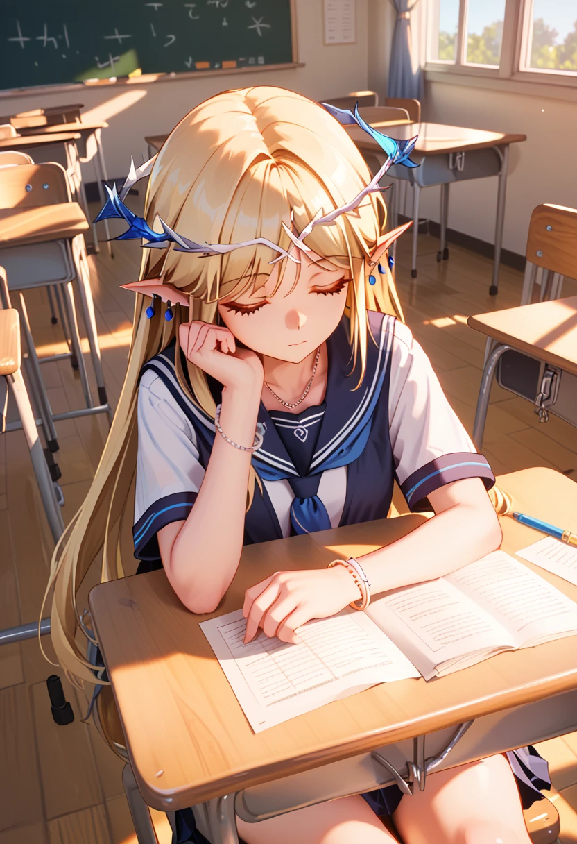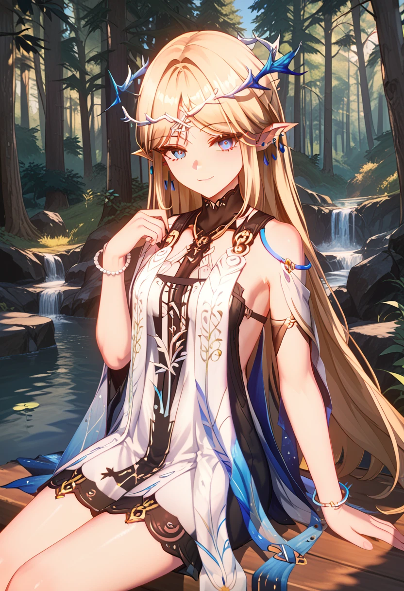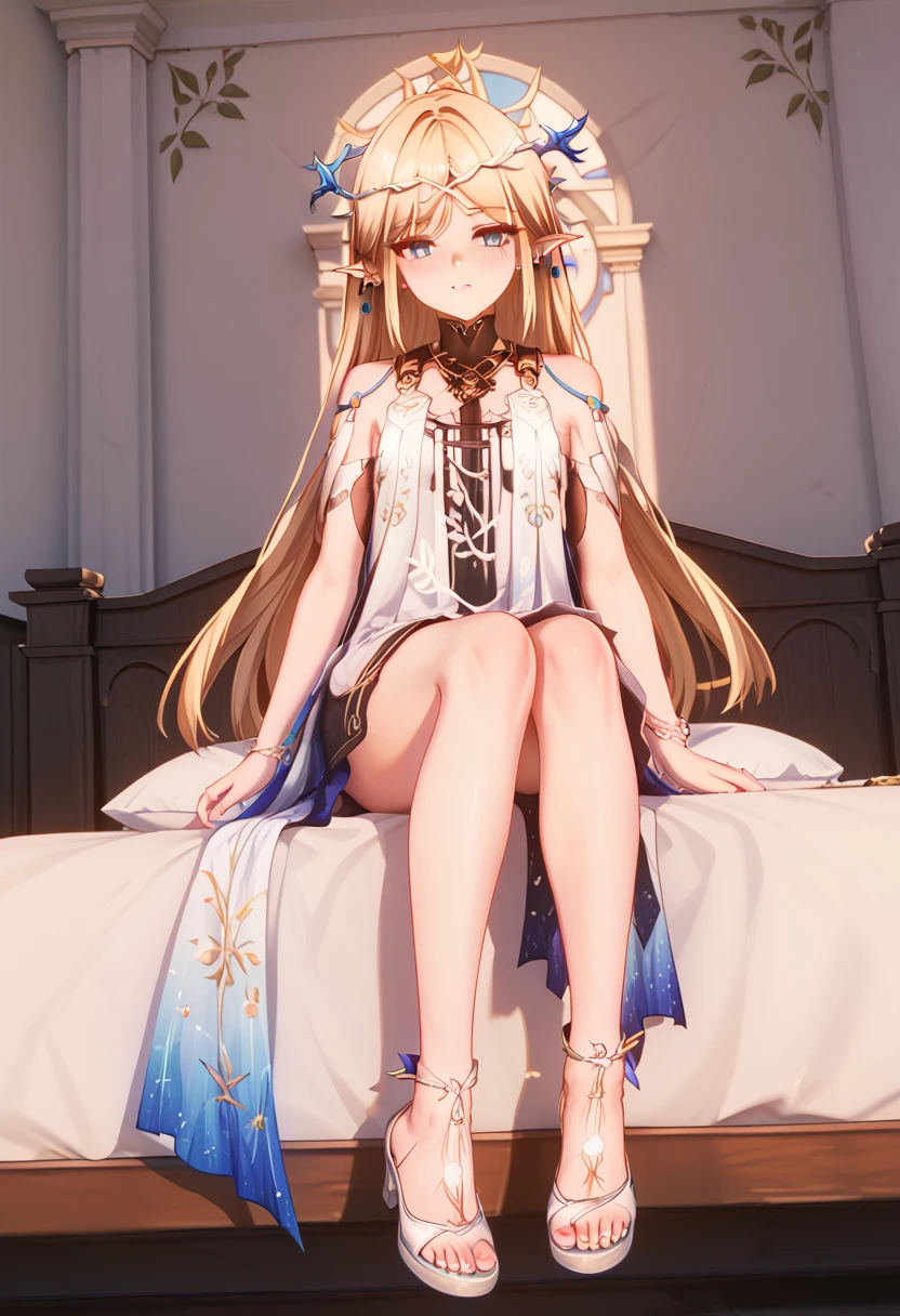 suggested prompts: 1girl, pointy ears, long hair, blue eyes, jewelry, blonde hair, bare shoulders, dress, white dress, earrings, bracelet