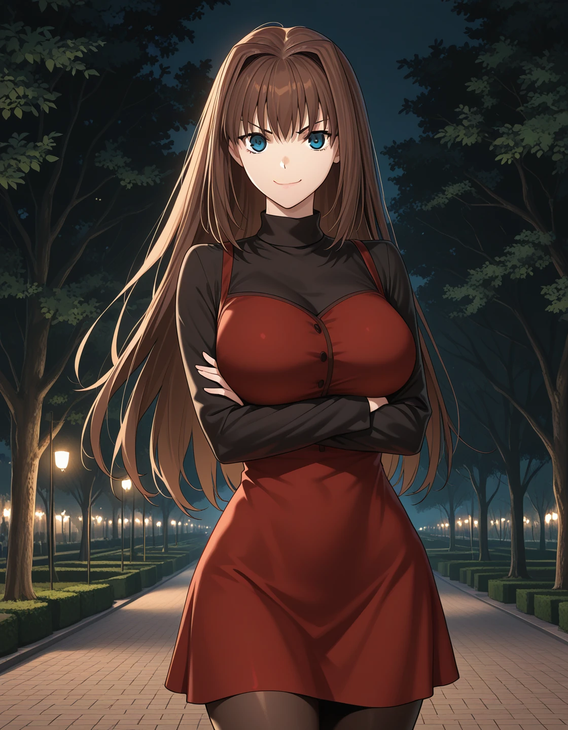 black shirt, turtleneck, long sleeves, red dress, short dress, pantyhose