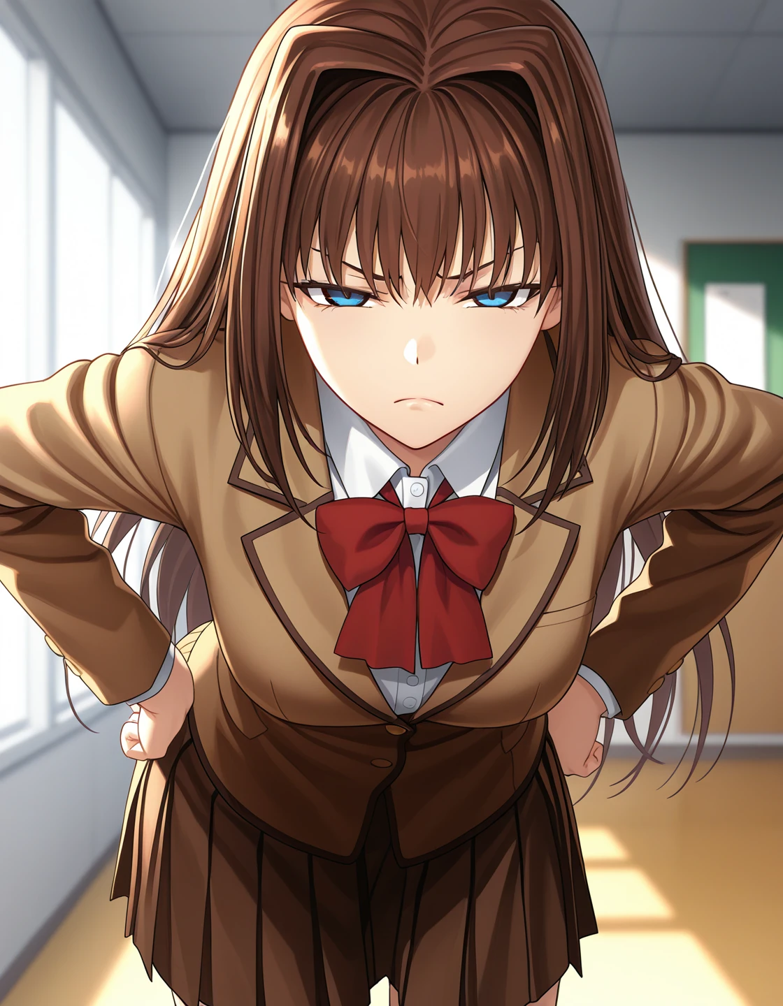 school uniform, blazer, white shirt, red bow, brown skirt, pleated skirt