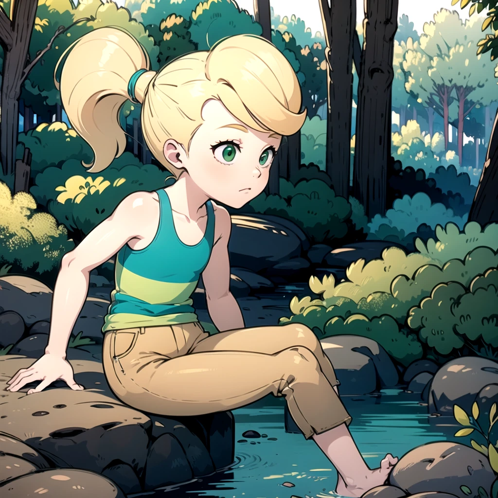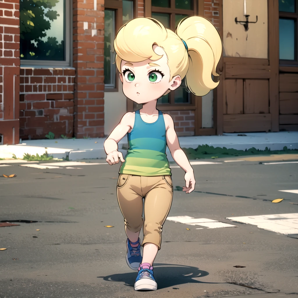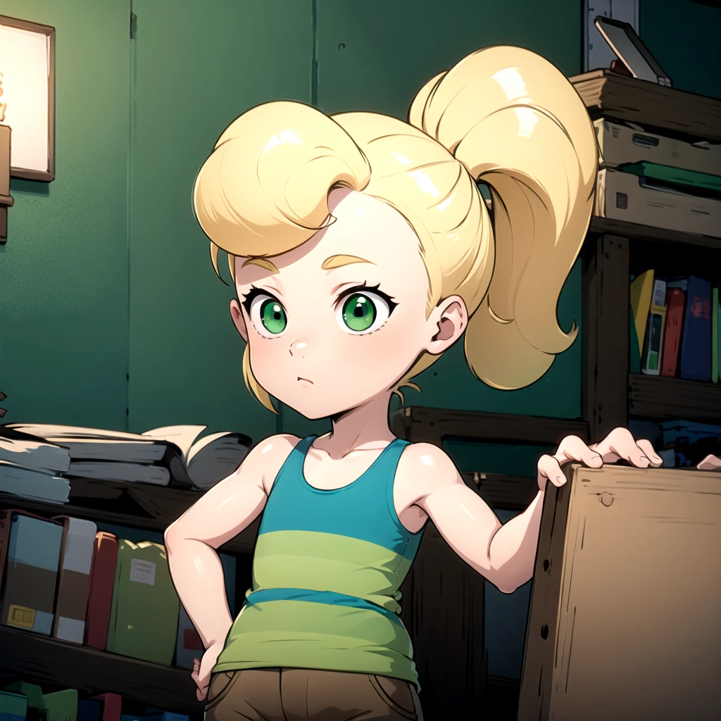 1girl, solo, blonde hair, cindy vortex, ponytail, green eyes, green tank top, brown pants, child, striped tank top, bangs,