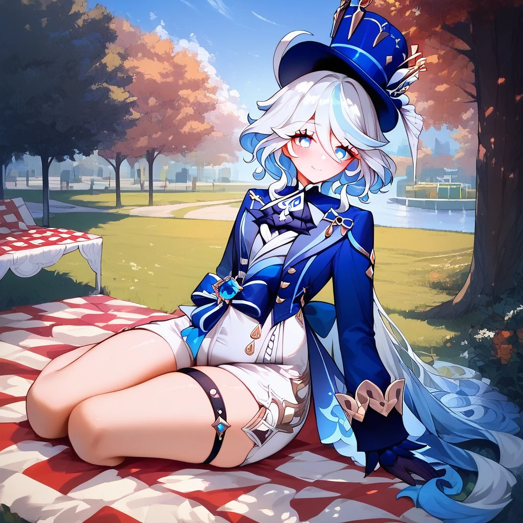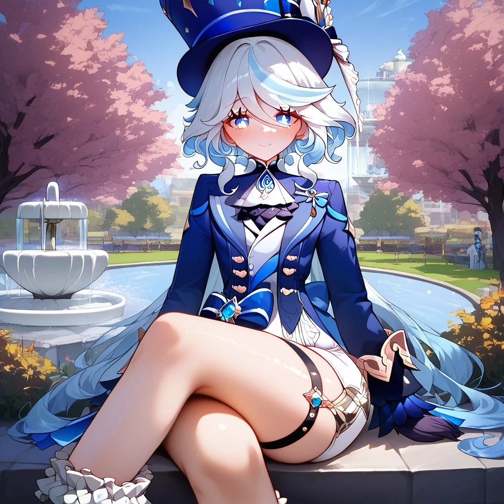 furina, multicolored hair, white hair, blue hair, gloves, hat, top hat, jacket, blue jacket, ascot, waist bow, white shorts, thigh strap, frilled socks, long eyelashes,