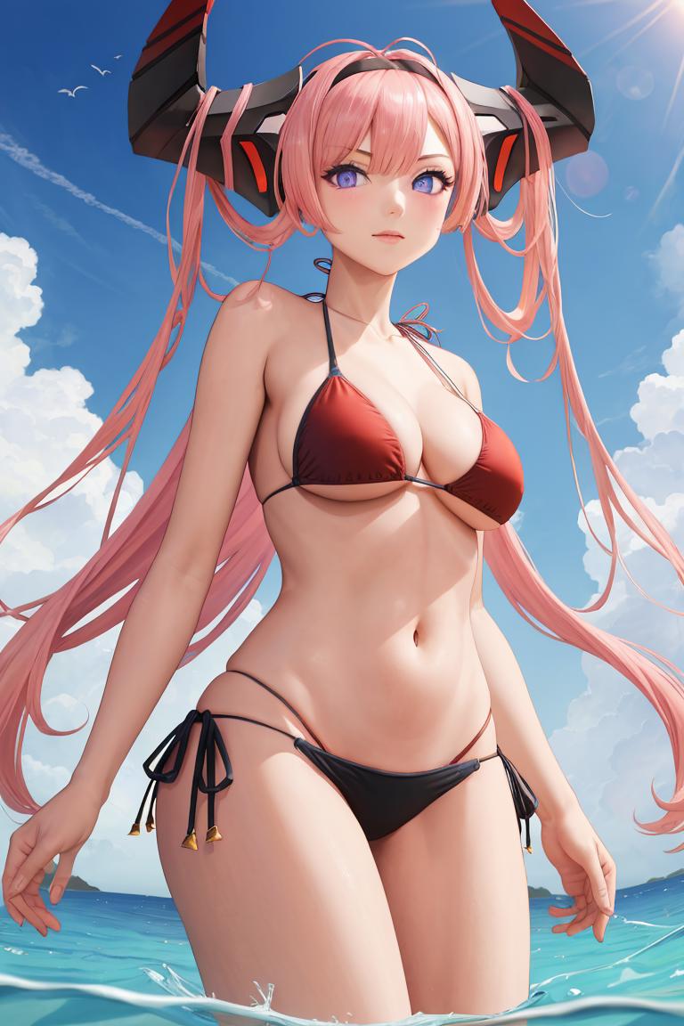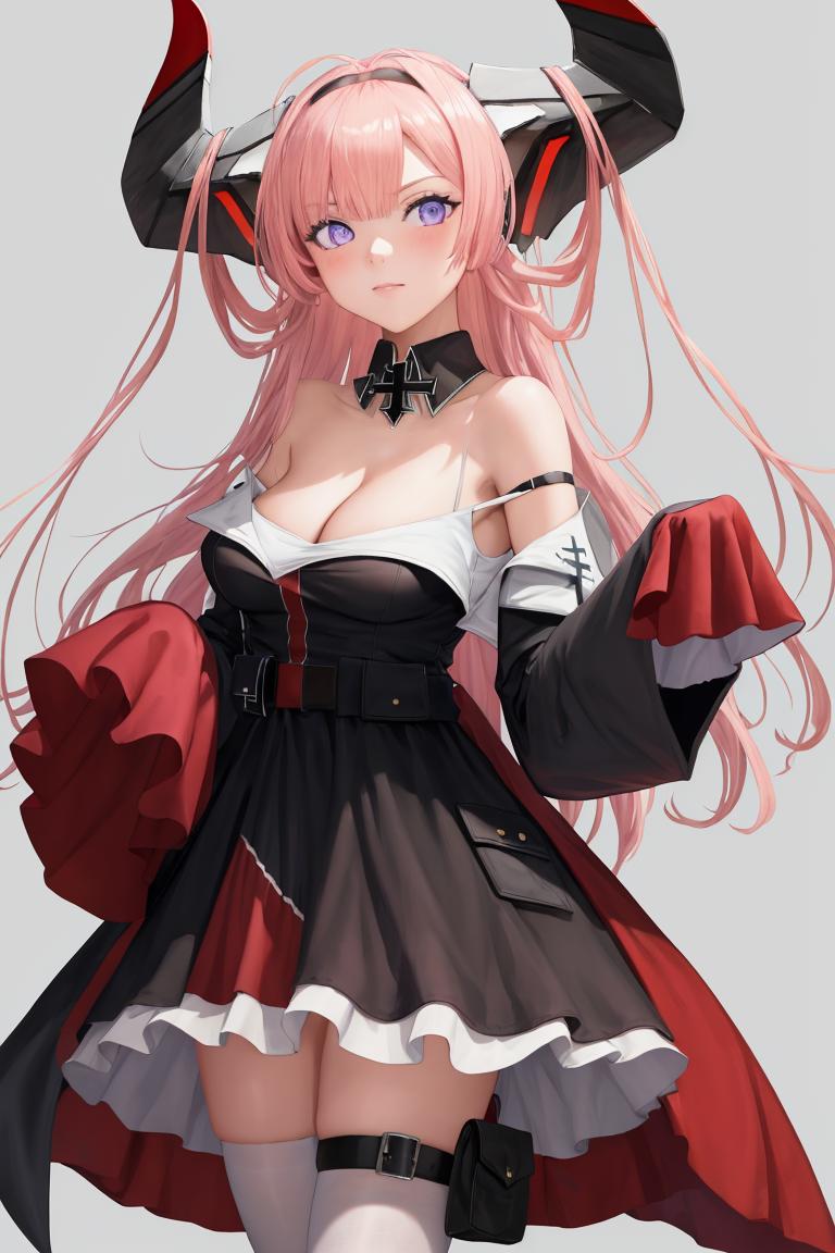 bare shoulders, cleavage, white thighhighs, iron cross, black dress, sleeves past fingers, thigh strap, wide sleeves