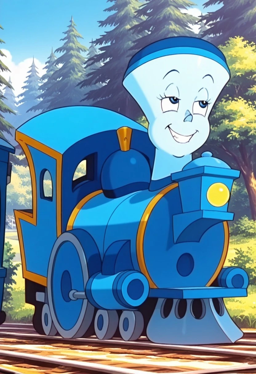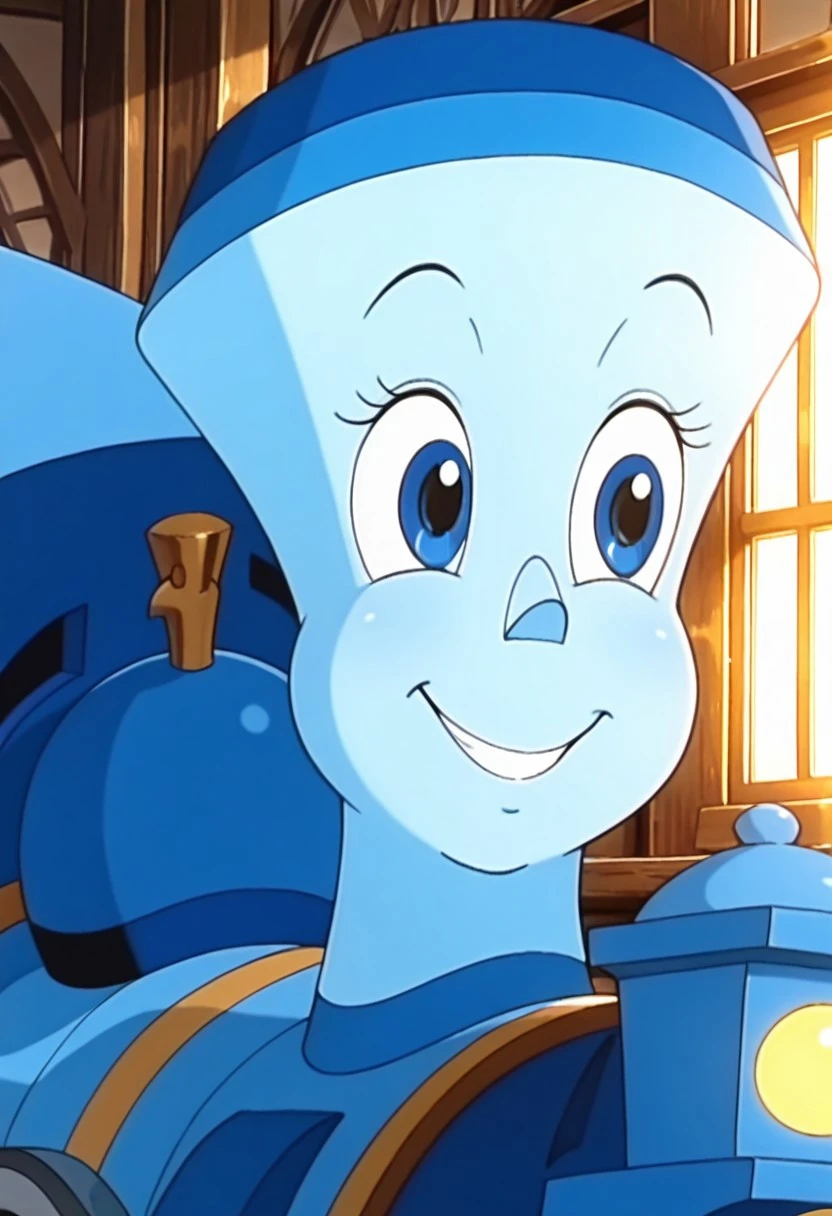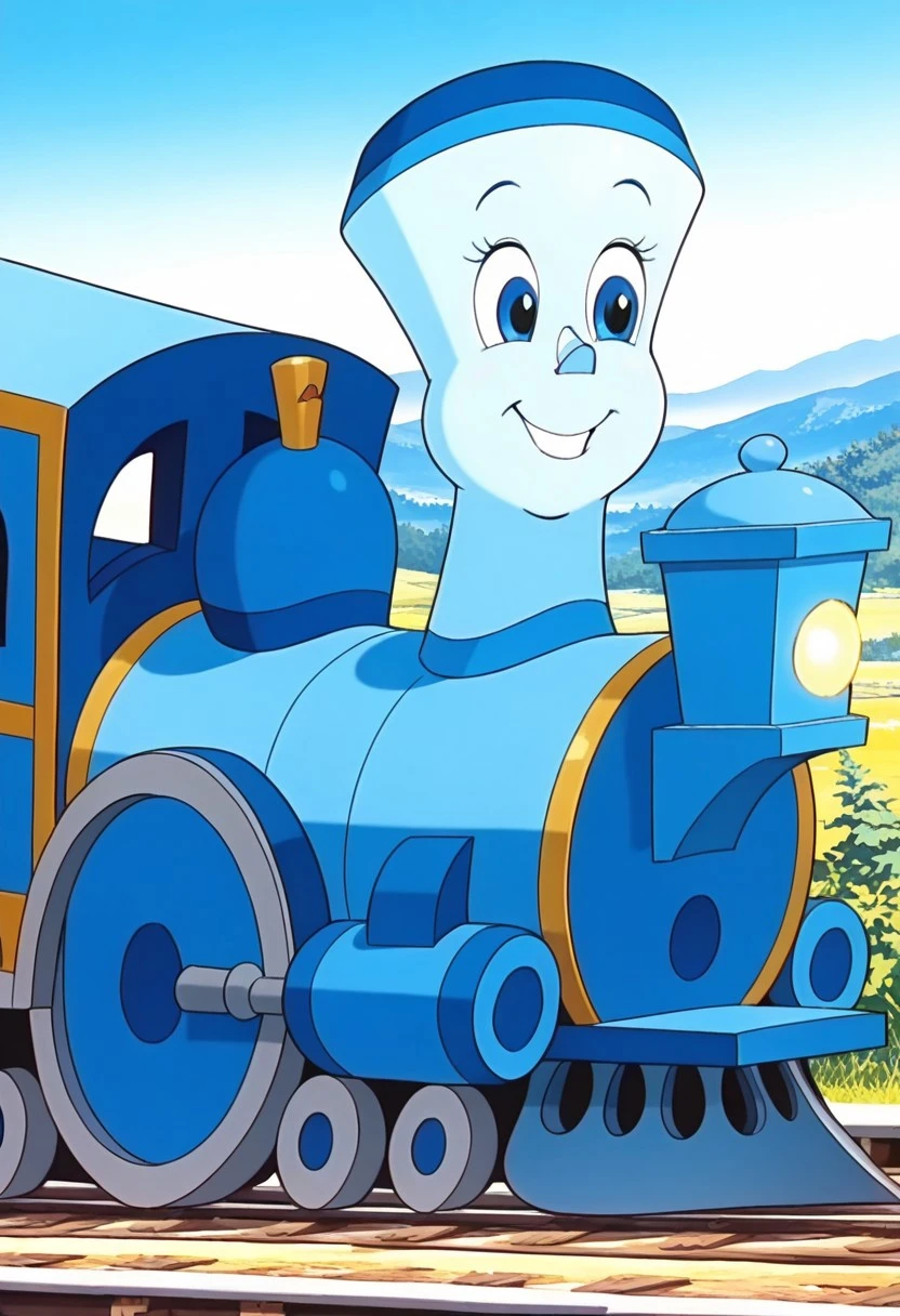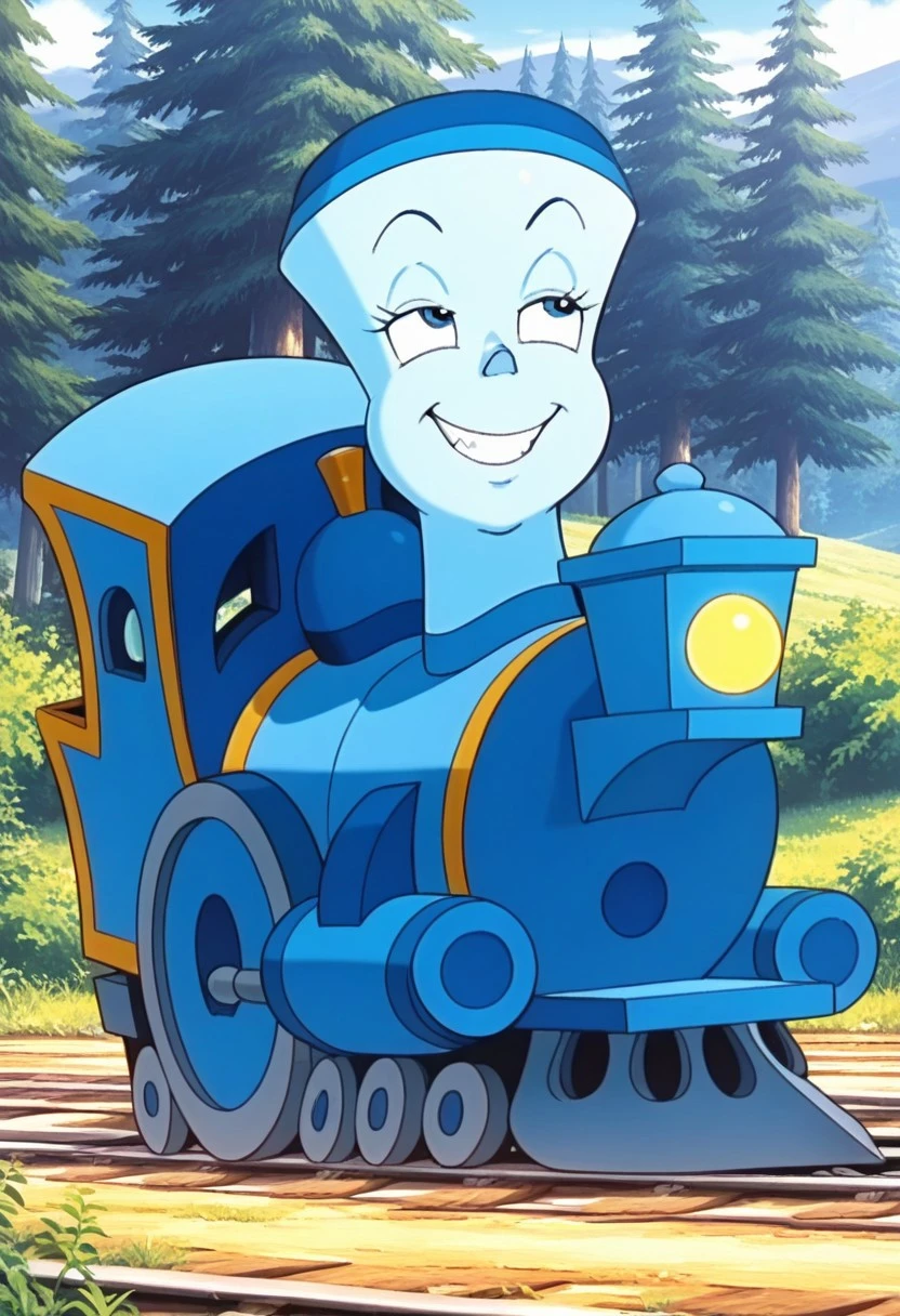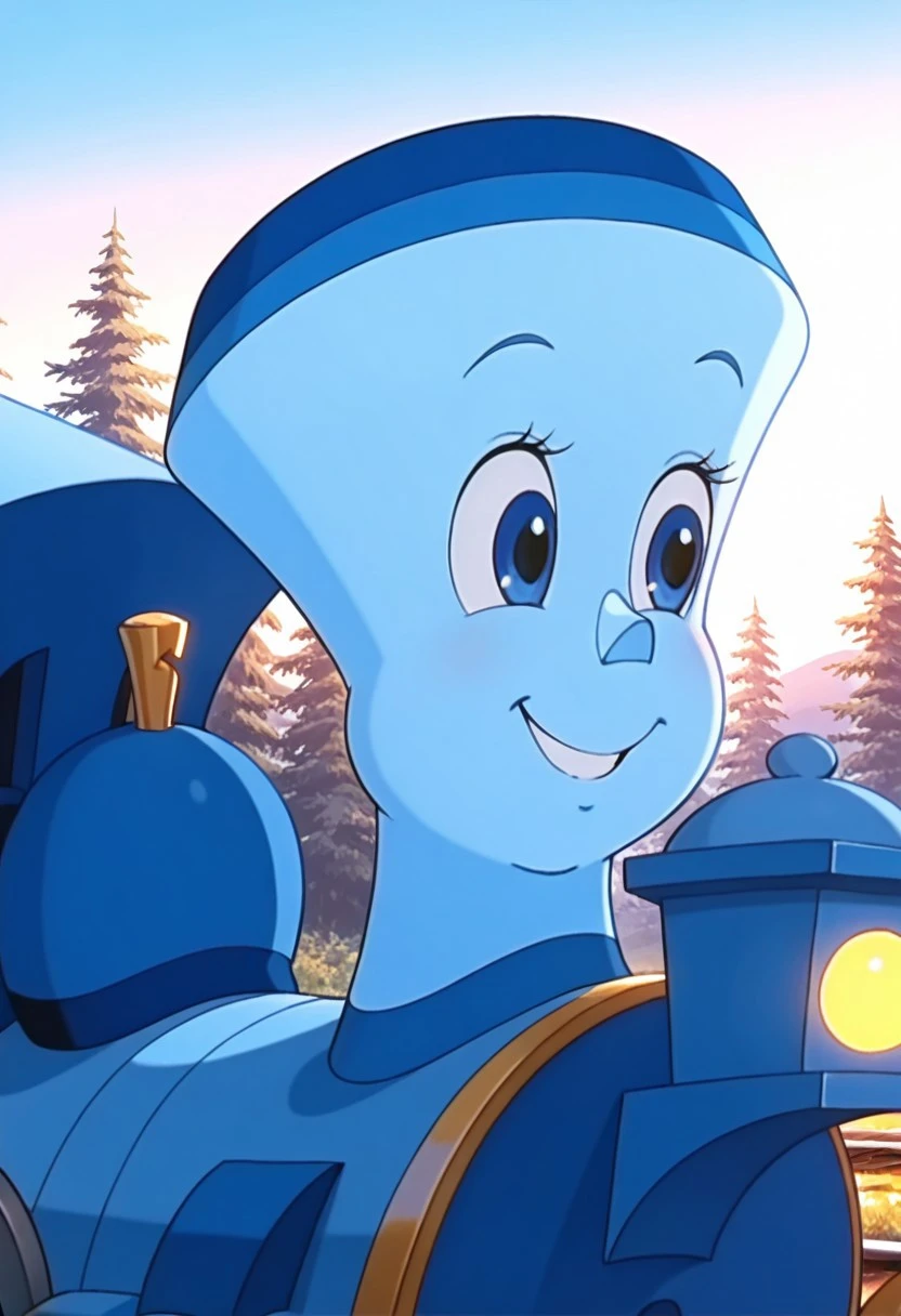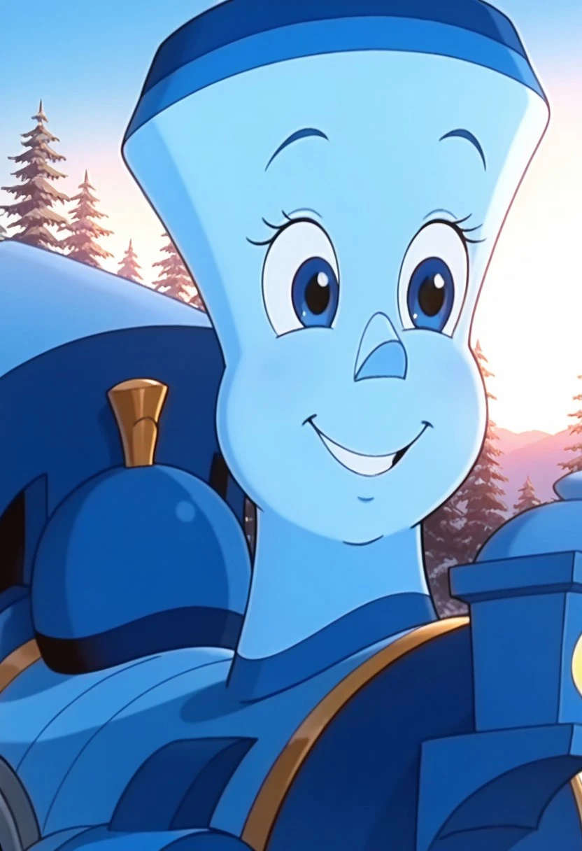Prompt: Tillie Illus, solo, 1girl, train, blue train, blue skin, big eyes, Blue Eyes