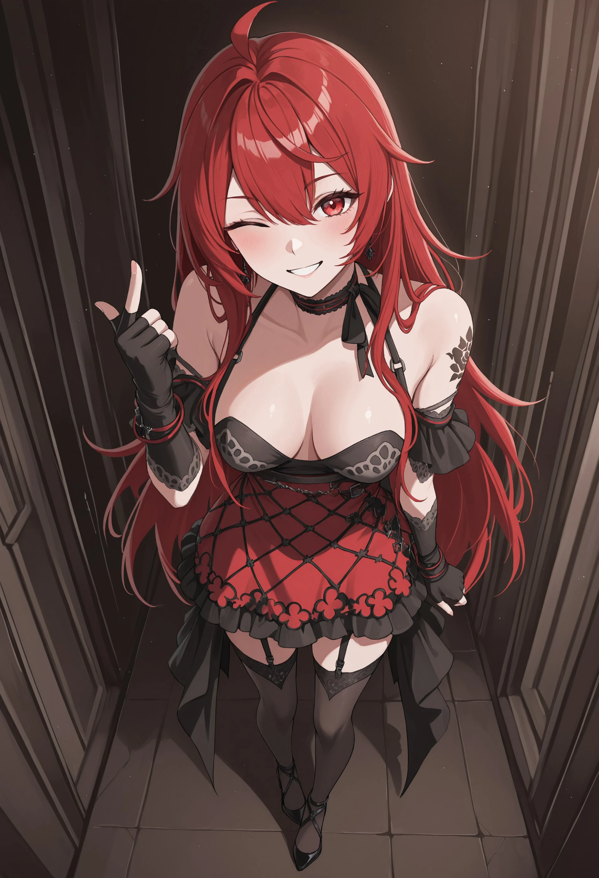 ShortDressNoNo, alternate outfit, official alternate hairstyle, ahoge, black earrings, ribbon choker, bare shoulders, detached sleeves, black fingerless gloves, elbow gloves, bracelet, tattoo, lace-trim, two-tone dress, halter dress, red dress, red bustle, zettai ryouiki, garter straps, black thighhighs, black high heels,
