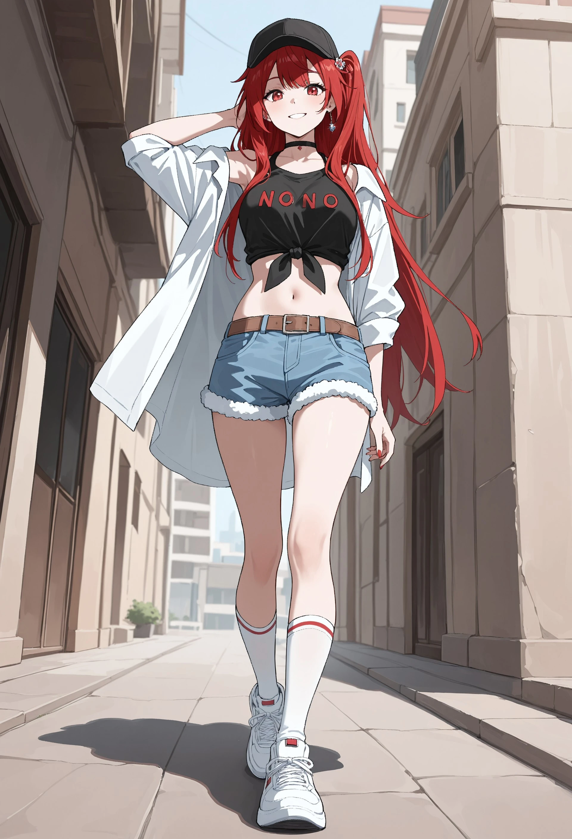 red nails, single earring, black choker, black crop top, tied shirt, clothes writing, midriff, open shirt, white oversized shirt, sleeves rolled up, brown belt, blue shorts, fur-trimmed shorts, white socks, kneehighs, white sneakers, baseball cap,