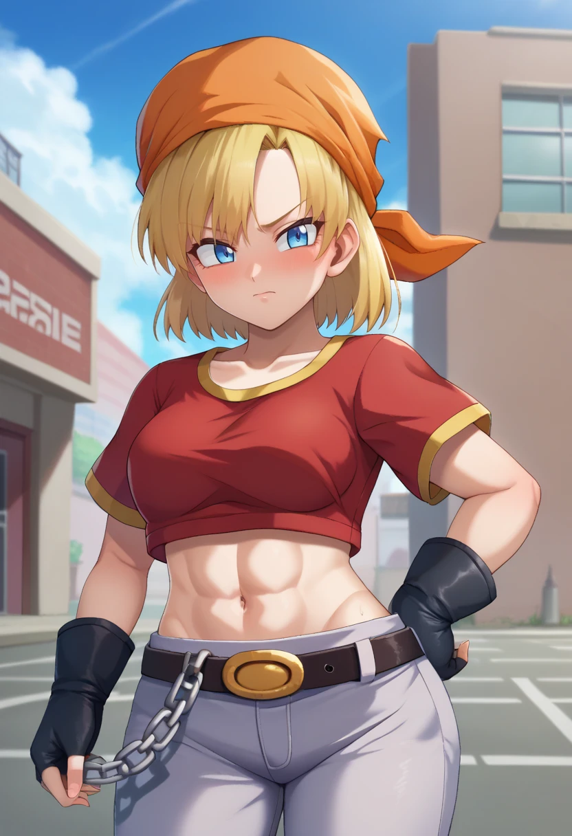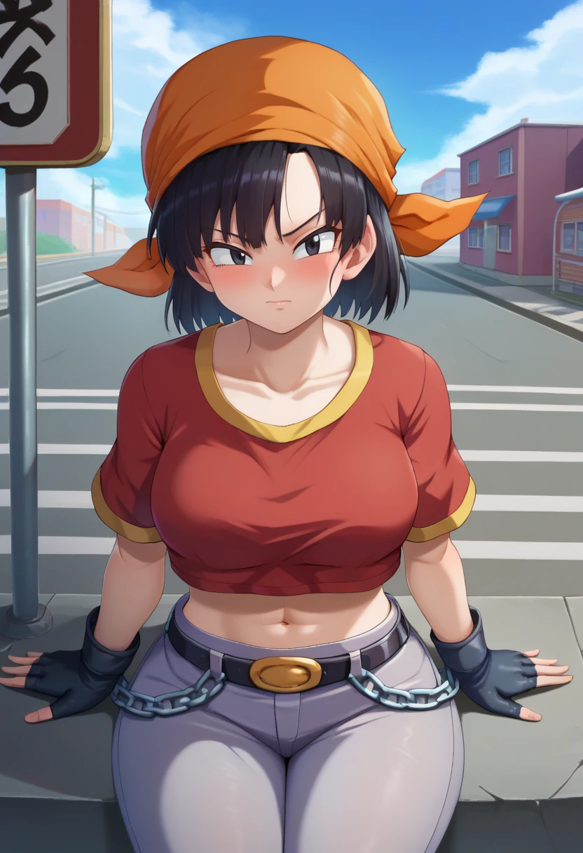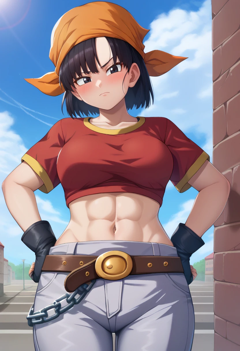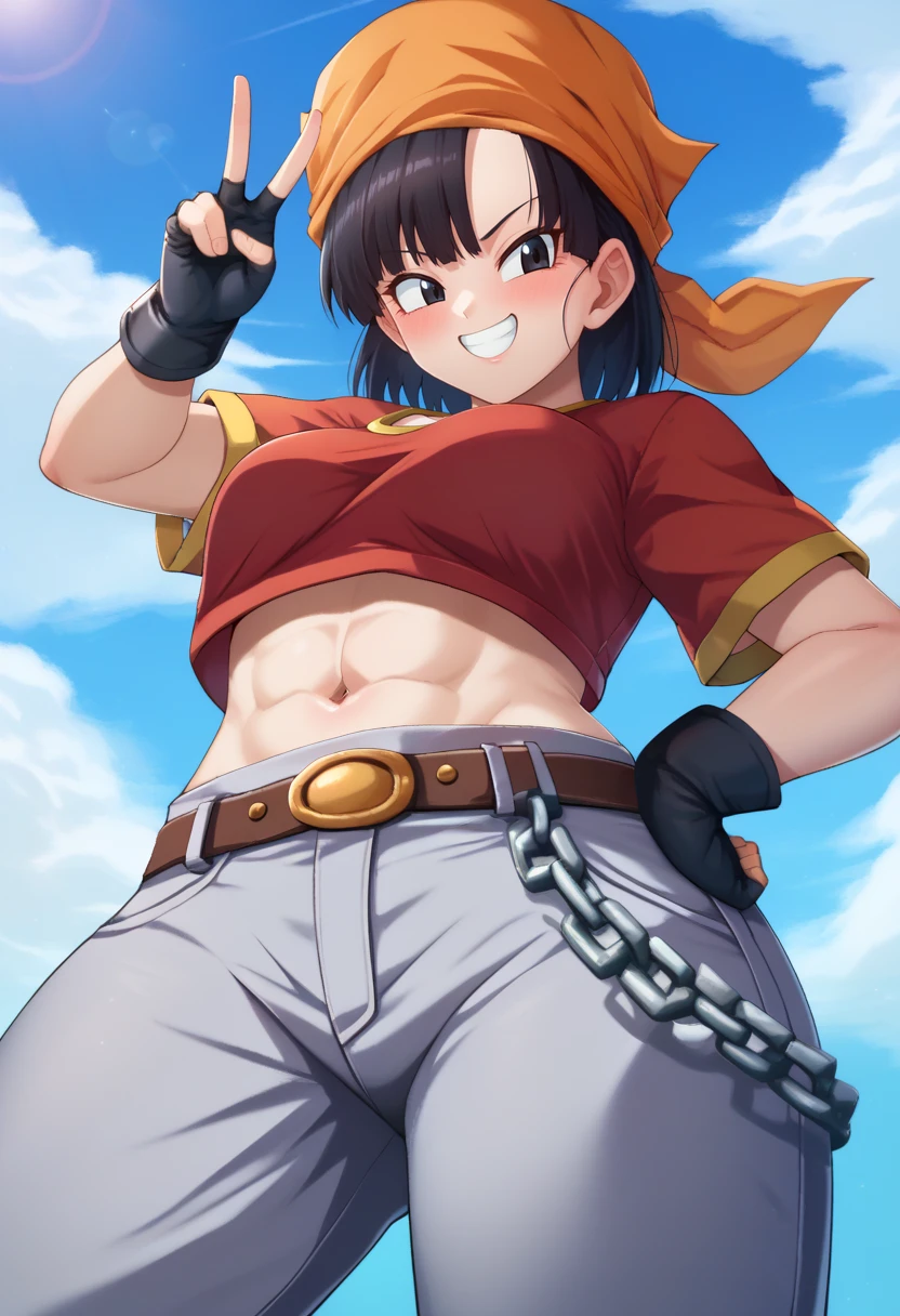 Promt: panSDXL, 1girl, solo, looking at viewer, blush, smile, short hair, shirt, black hair, gloves, navel, short sleeves, :d, black gloves, midriff, belt, pants, fingerless gloves, black eyes, crop top, v, chain, red shirt, black belt, bandana, grey pants, cowboy shot,