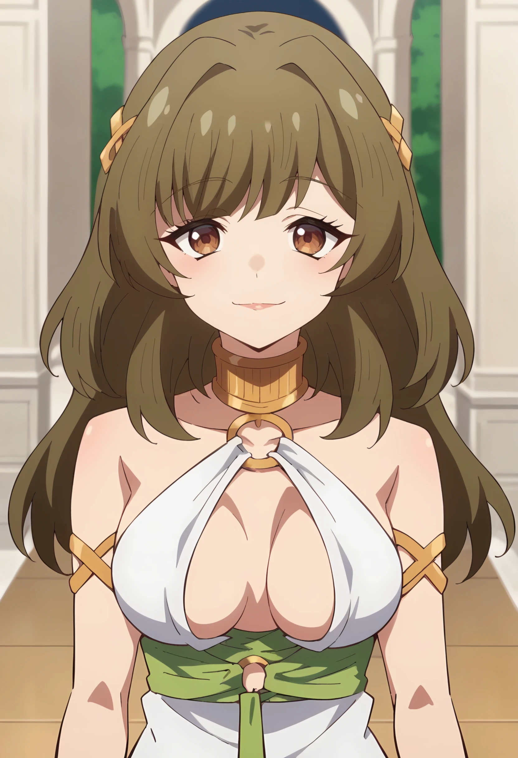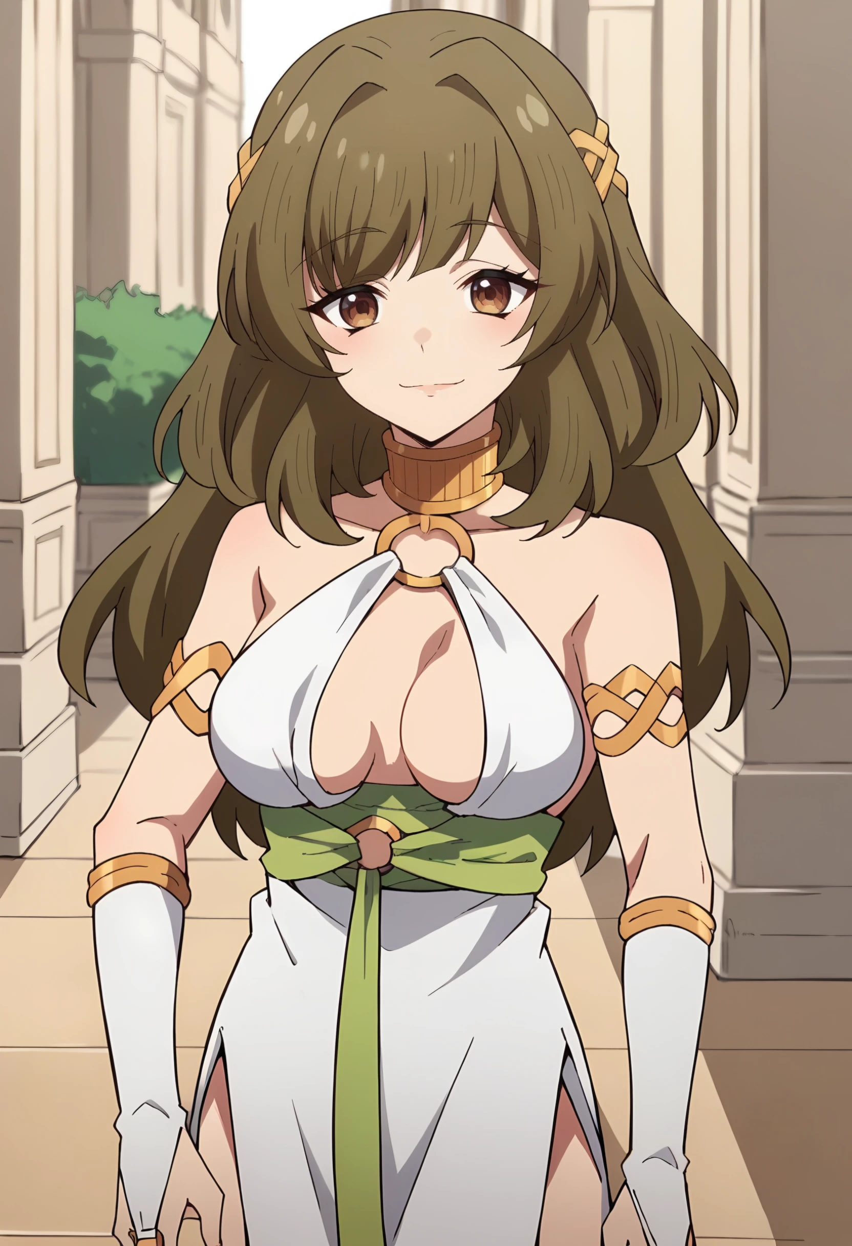 outfit: white dress, bridal gauntlets,bare shoulders,standing, cleavage, medium breasts, o-ring,hair ornament,