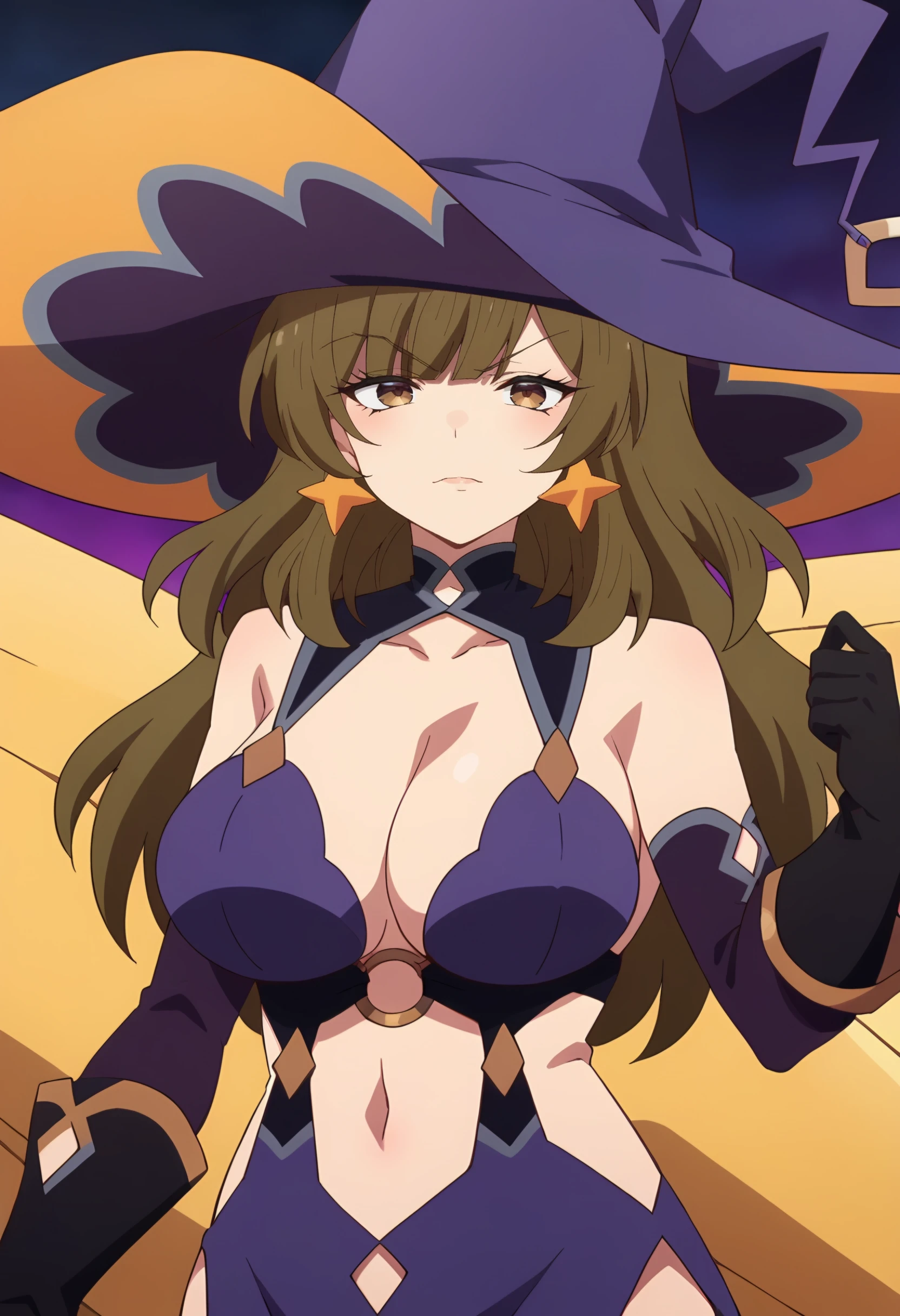 outfit 2 : witch hat, jewelry, black gloves, star earrings, large breasts, witch, purple dress , clothing cutout, detached sleeves, elbow gloves, bare shoulders, cleavage, o-ring top,