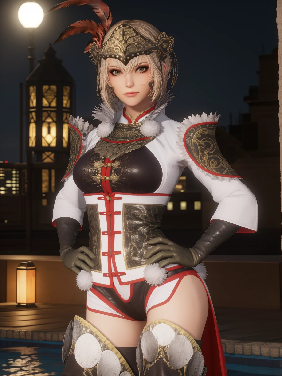 ZSGWSlvlingqiYP, 1girl, solo, gloves, short hair, thighhighs, blonde hair, armor, looking at viewer, feather hair ornament, forehead protector, dress,long sleeves, boots,cityscape, night,poolside, hand on hip,