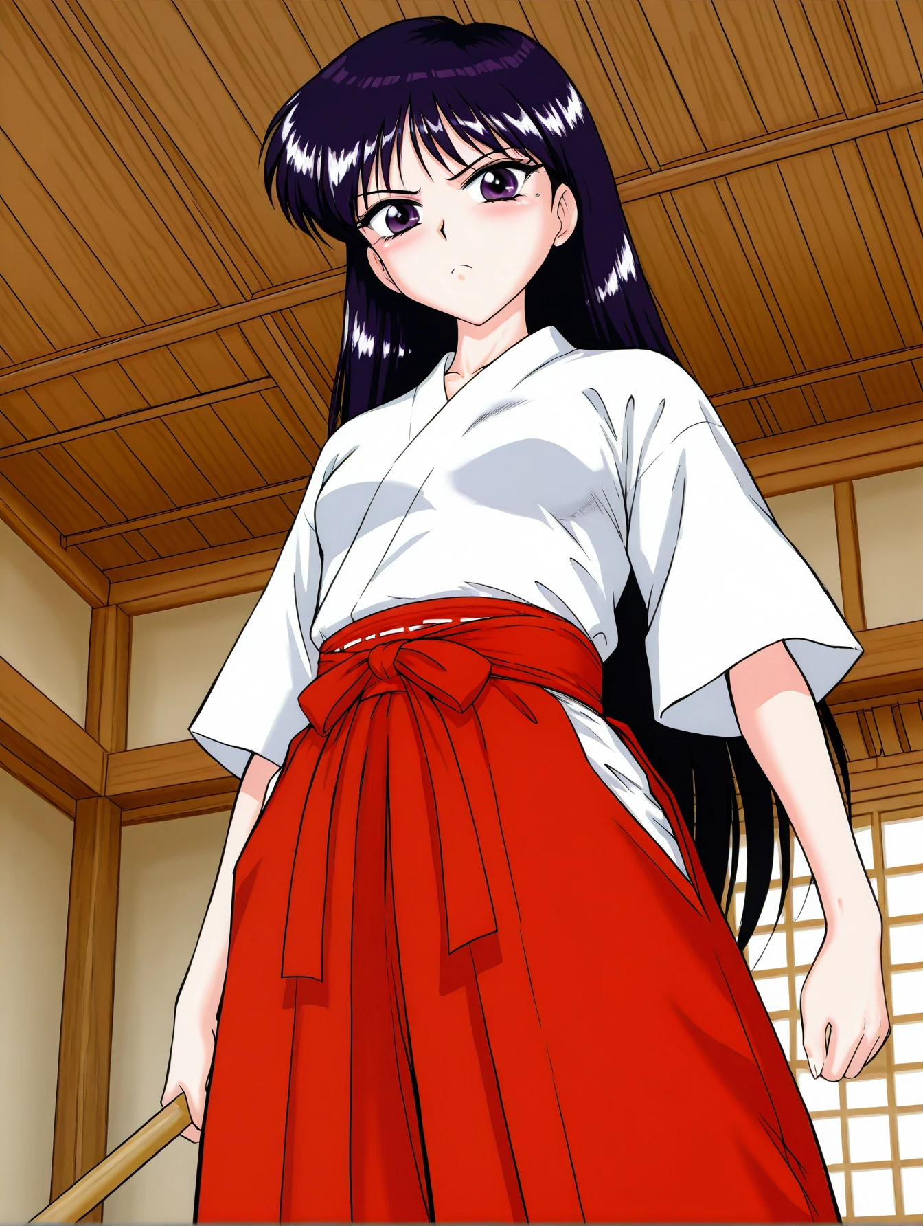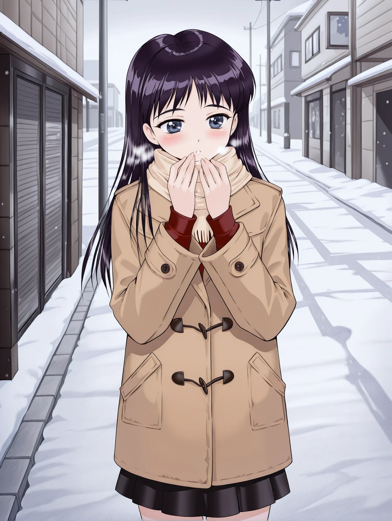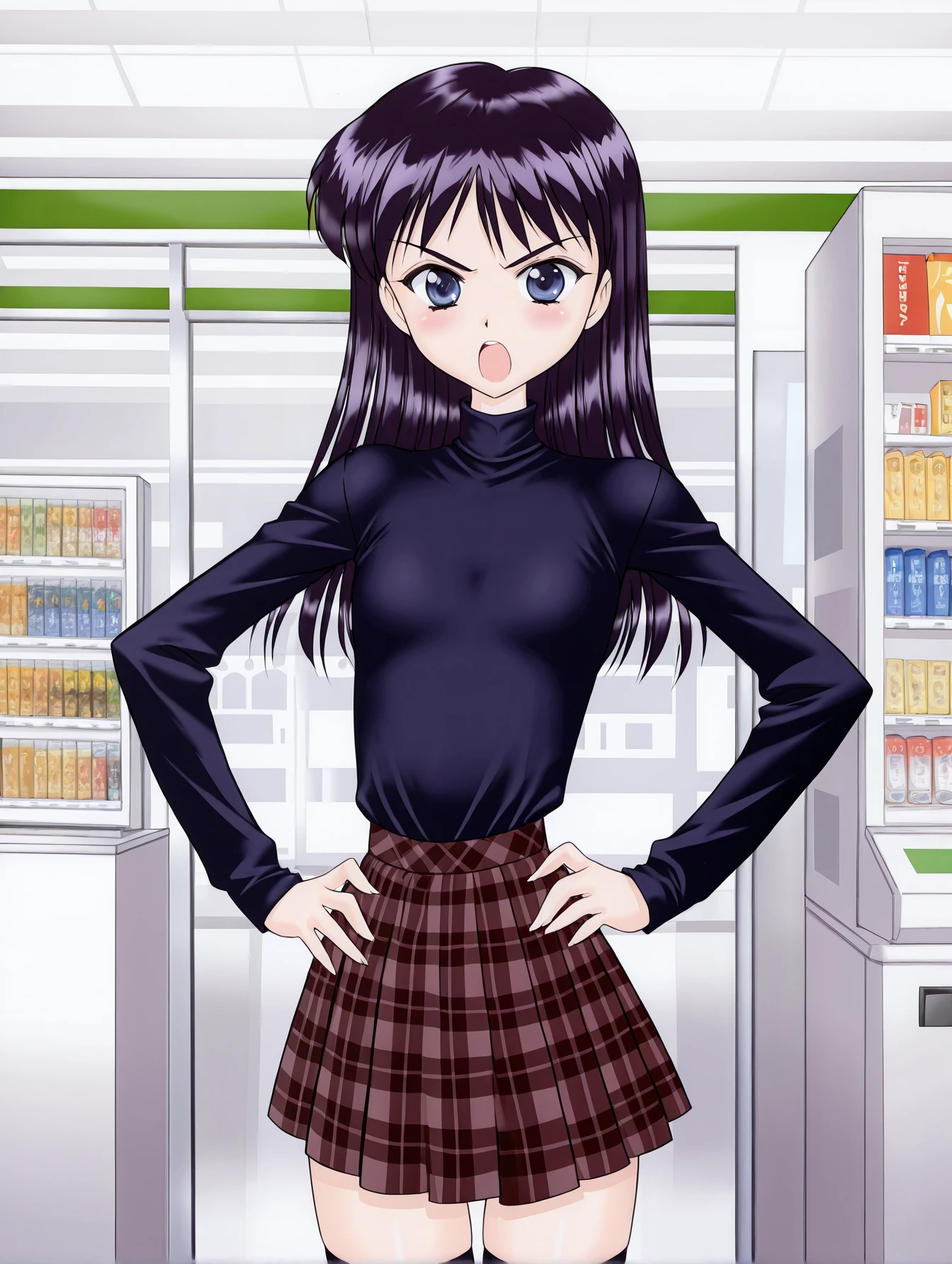 ninamori eri, purple hair, dark blue eyes, red shirt, long sleeves, turtleneck, black skirt, miniskirt