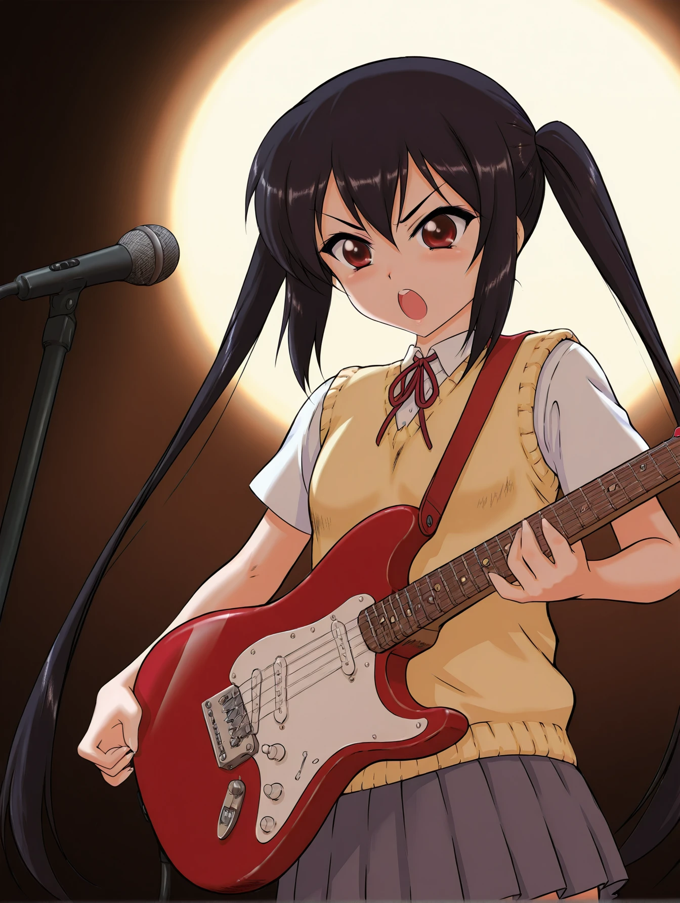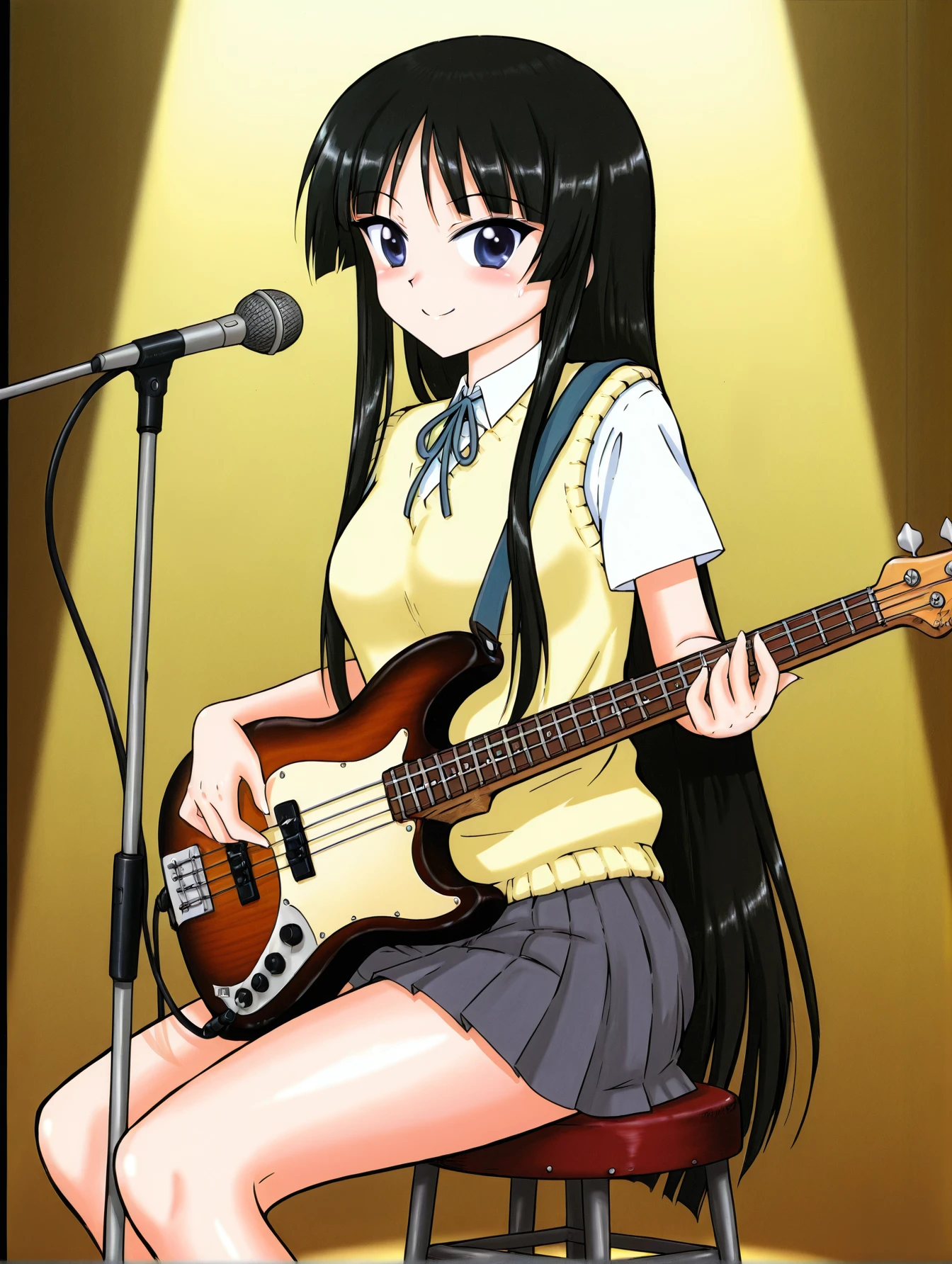 akiyama mio, blue eyes, black hair, sakuragaoka high school uniform, yellow sweater vest, pleated skirt, miniskirt