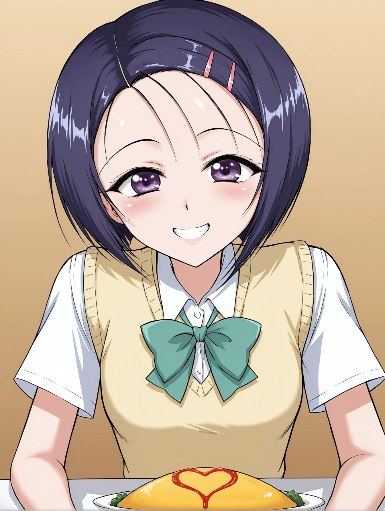 sairenji haruna, hairclip, yellow sweater, sweater vest, (green bow:0.6), green skirt, (yellow skirt:0.8), plaid skirt