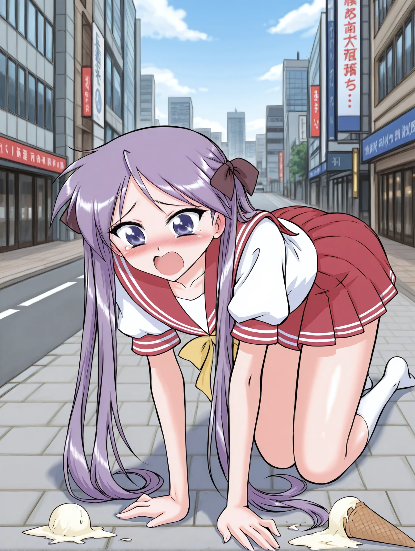 hiiragi kagami, hair ribbon, ryouou school uniform, (red sailor collar:0.6), (red skirt:0.6)