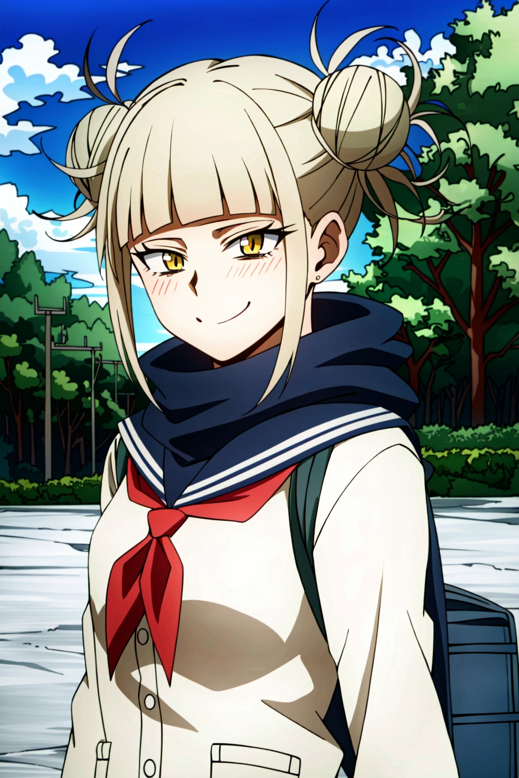 Himiko Toga, 1girl, toga himiko, double bun, solo, hair bun, bangs, yellow eyes, sky, day, blonde hair, messy hair, looking at viewer, cloud, blush, blunt bangs, outdoors, blue sky, neckerchief, red neckerchief, school uniform, upper body, closed mouth, scarf, sidelocks, bags under eyes, sailor collar, teeth, serafuku, tree, frown, short hair, cardigan
