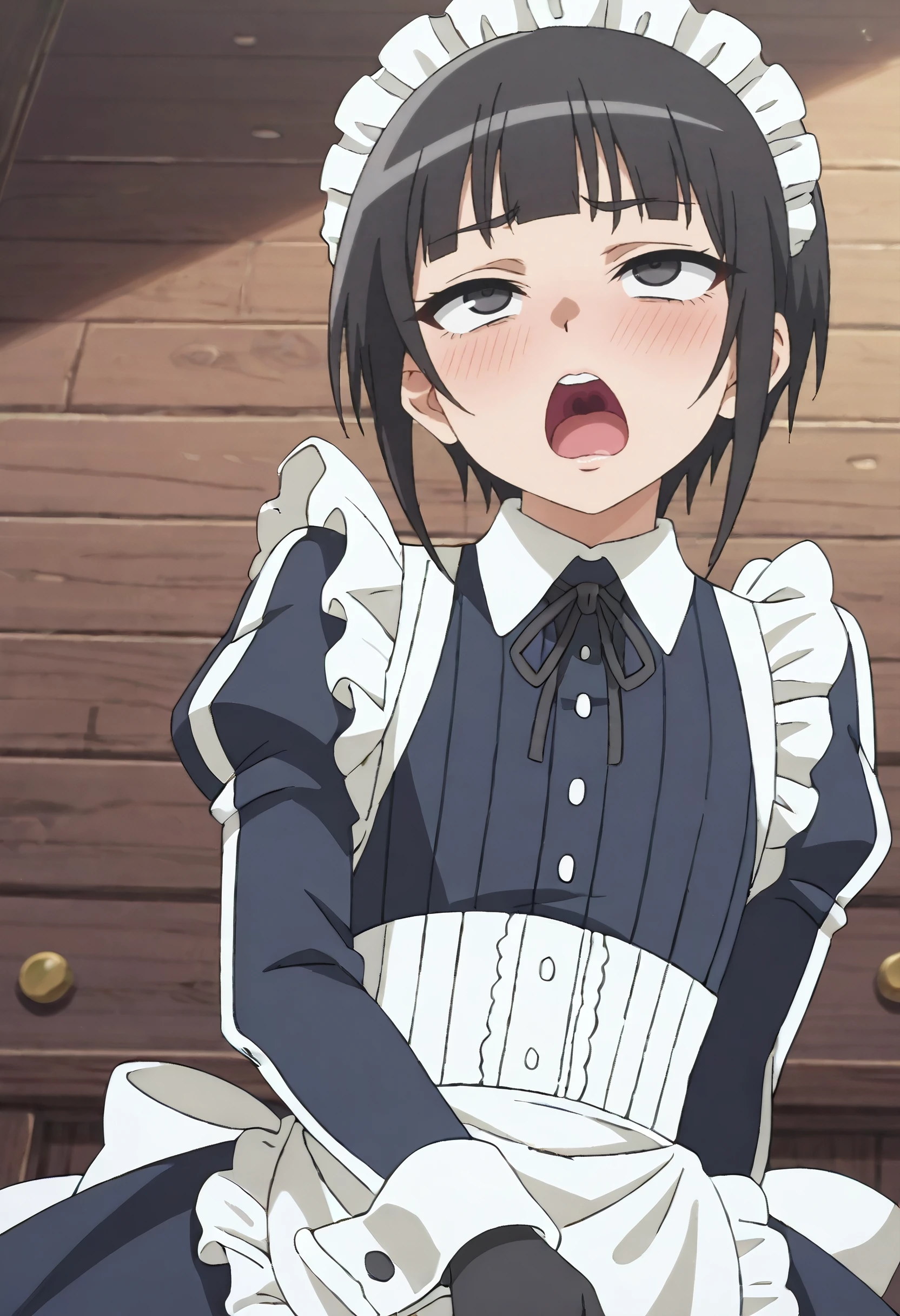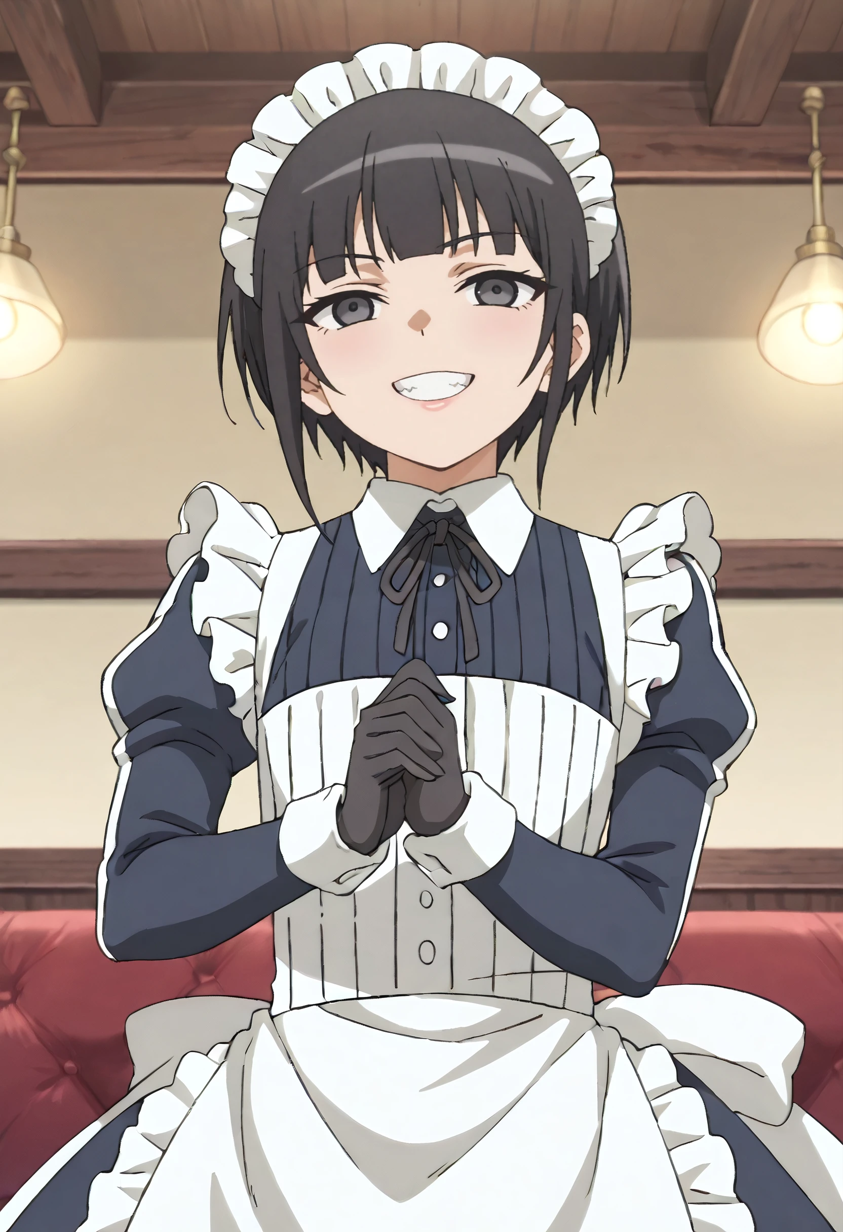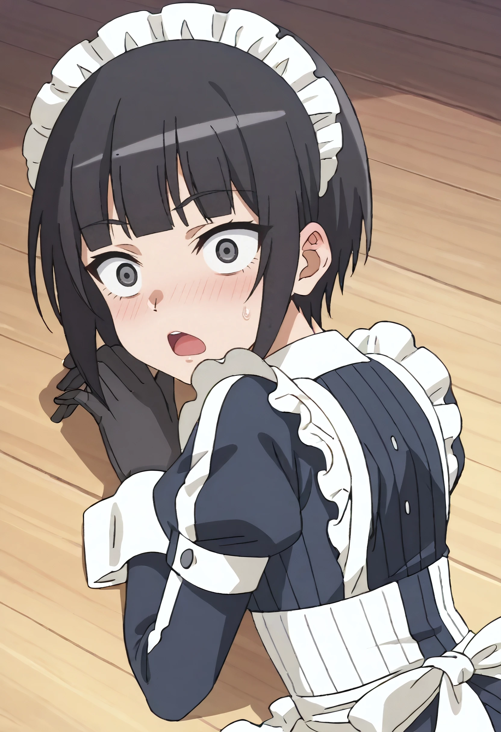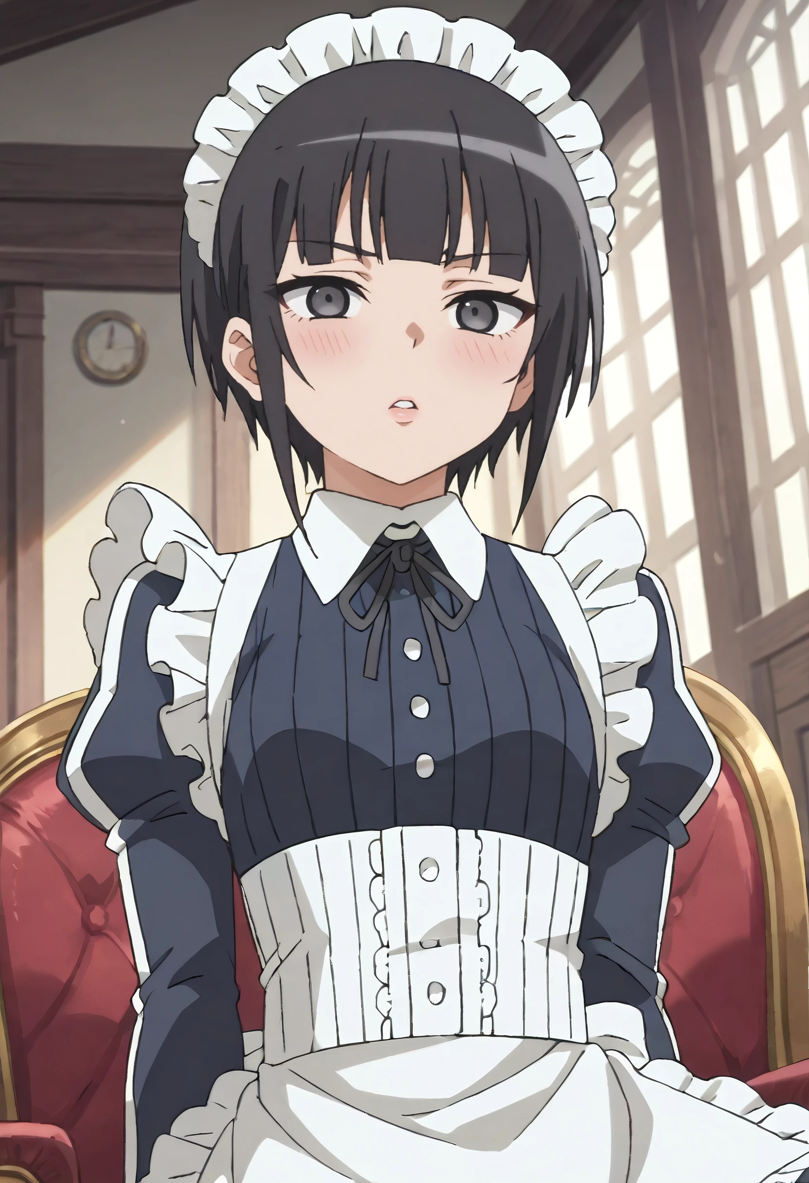 KuonOutfit, maid, maid headdress, maid apron, apron, frills, enmaided, white apron, dress, ribbon, black ribbon, frilled apron, neck ribbon, long sleeves, black dress, puffy sleeves, juliet sleeves, gloves, black gloves, collared dress, bow, back bow, unconventional maid,