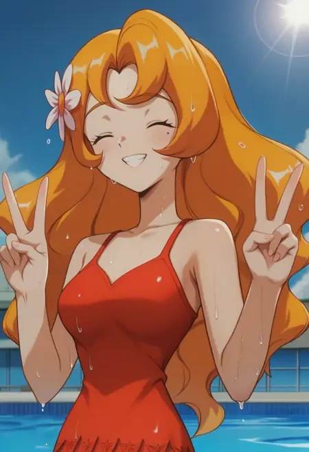 PMDaisy, green eyes, mole under eye, bangs, long hair, orange hair, wavy hair, hair ornament, hair flower,